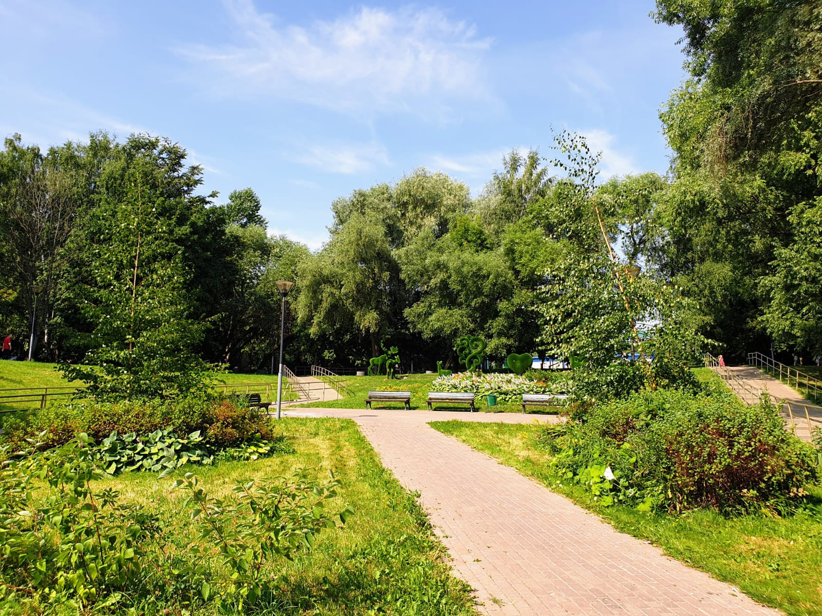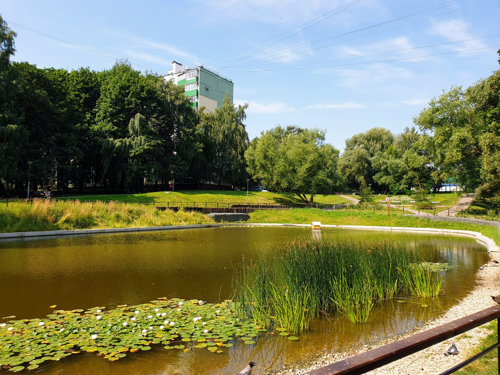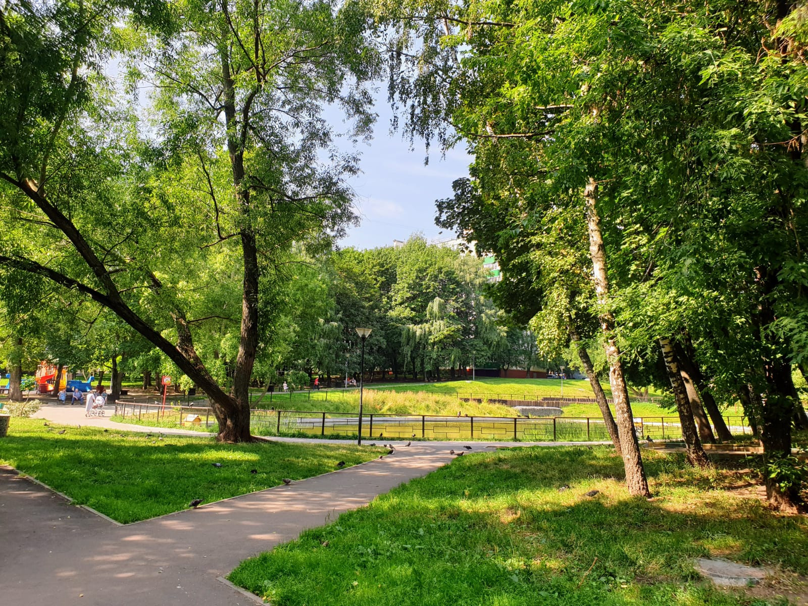 Уютные просторные дворы, много детских и спортивных площадок, футбольное поле, хоккейная коробка, пруд с утками.
