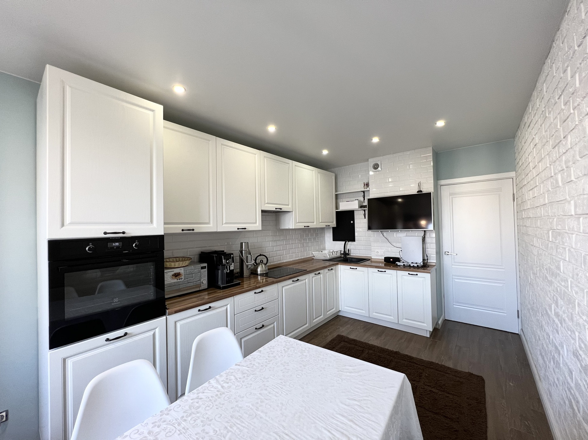 В кухне вместительный гарнитур со встроенными духовкой и варочной панелью.