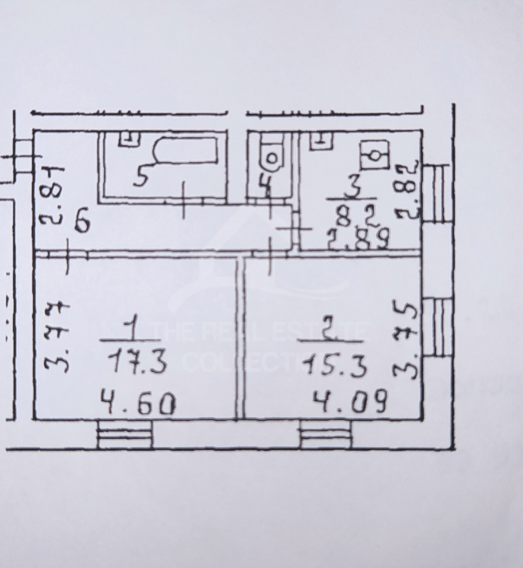 Четыре окна. Кухня 8,2 кв.м. Две раздельные жилые квадратные комнаты 17,3 и 15,3 кв. м. Коридор 9,2 кв.м. Ванная 4,2 кв.м. Туалет 1,5 кв.м.