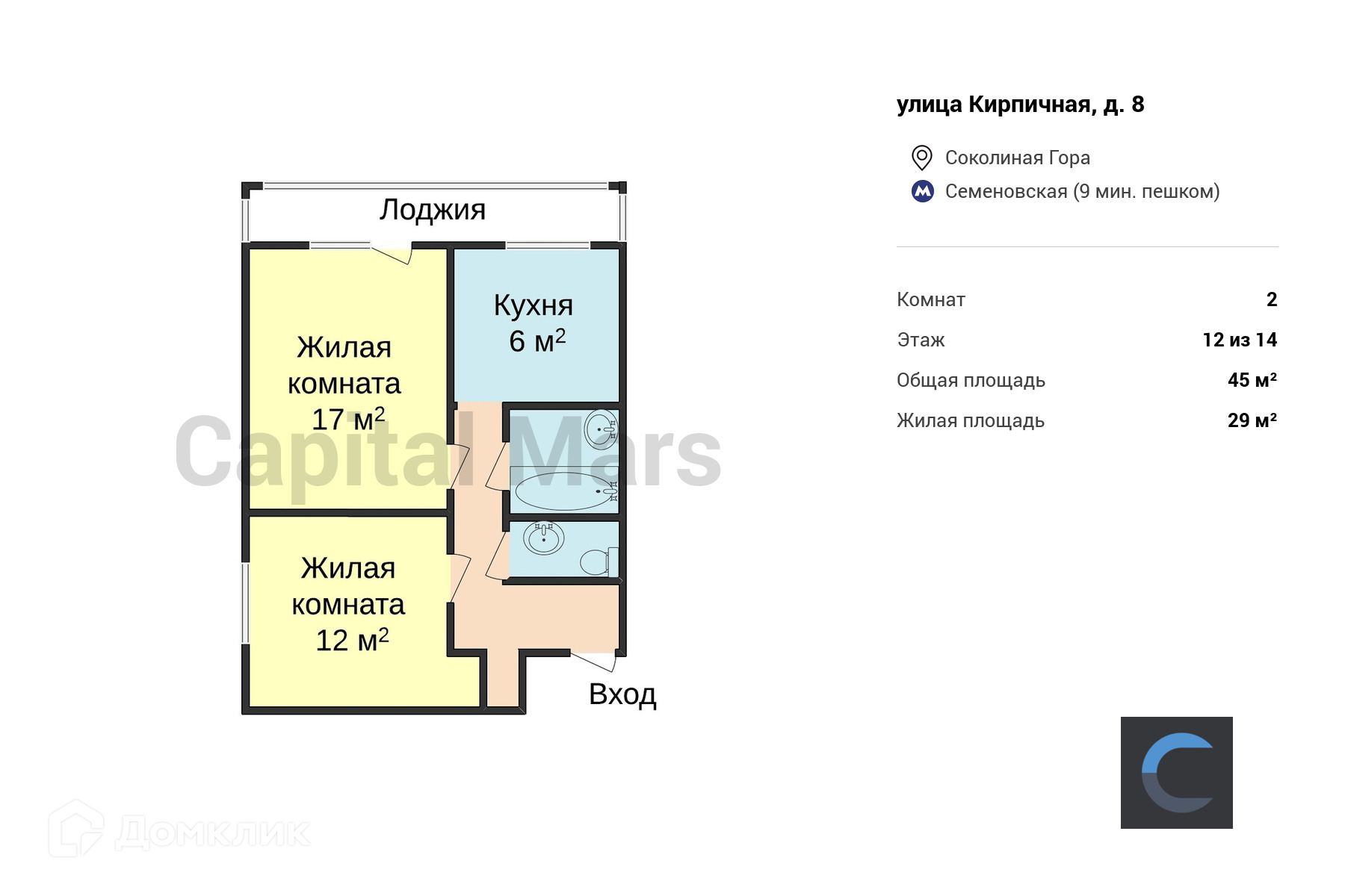 2-комнатная квартира, 45 м2, этаж 12 / 14, на продажу в Москве, Кирпичная улица, 8