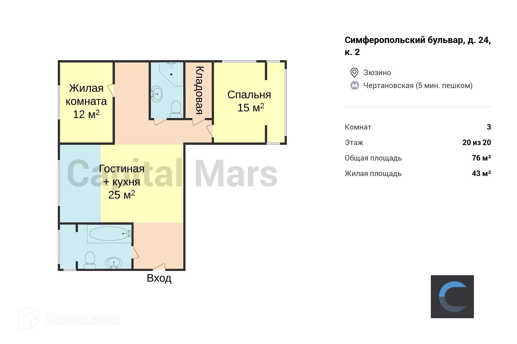 3-комнатная квартира, 76 м2, этаж 20 / 20, на продажу в Москве, Симферопольский бульвар, 24к2