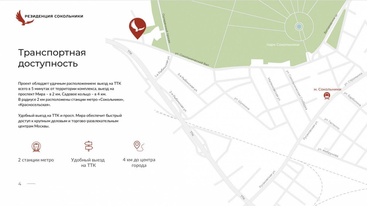 Для жителей и гостей Резиденции работает круглосуточный Room service: встретить курьера, забрать вещи из химчистки, вежливый персонал всегда к вашим услугам. В пешей доступности метро Сокольники, Рижская, магазины, детские сады, школы и поликлиники, парк "Сокольники". Удобный съезд на ТТК (Рижская эстакада). После постройки Рижской