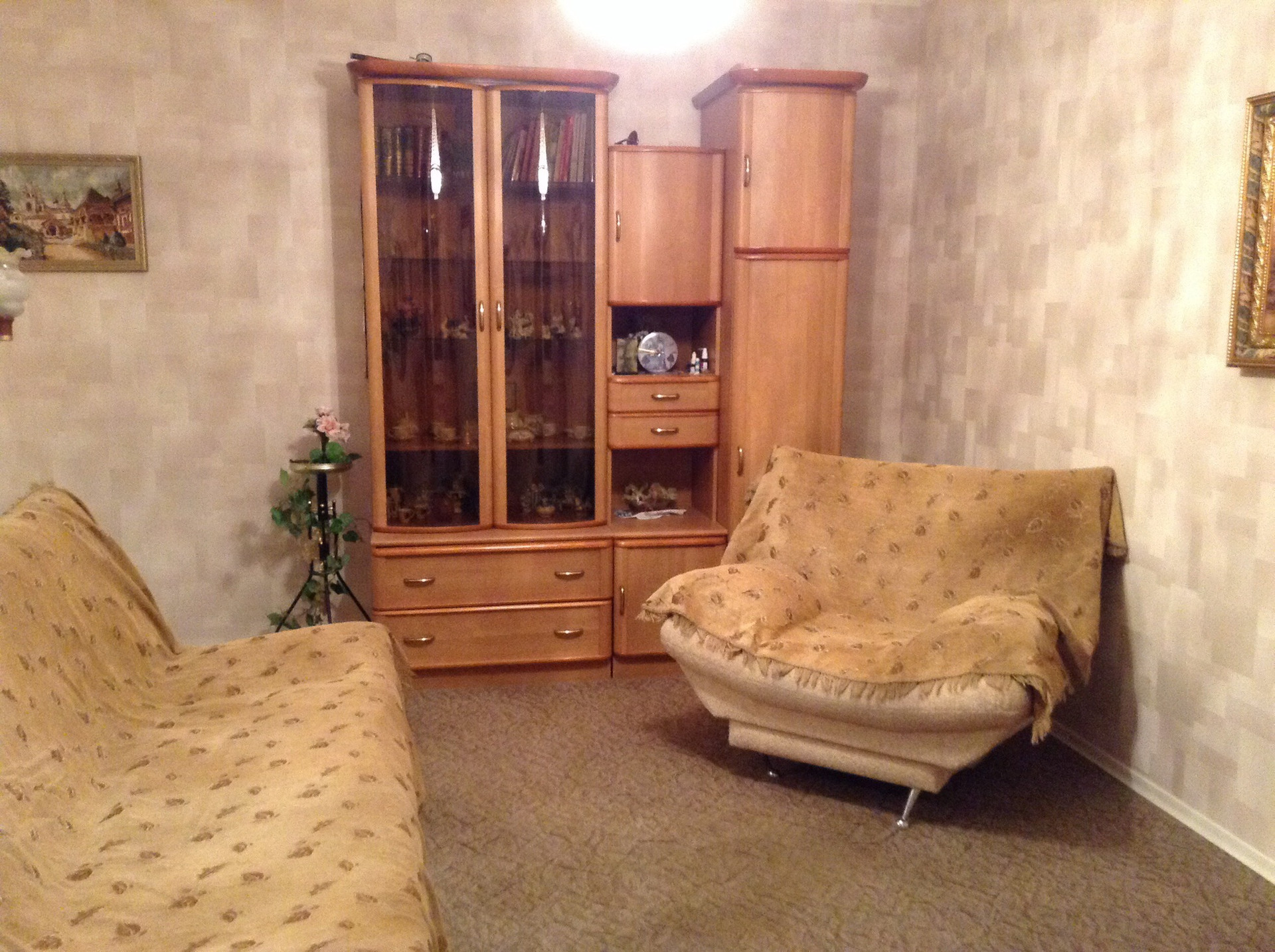 В большой комнате: диван раскладной, кресло, стенка.