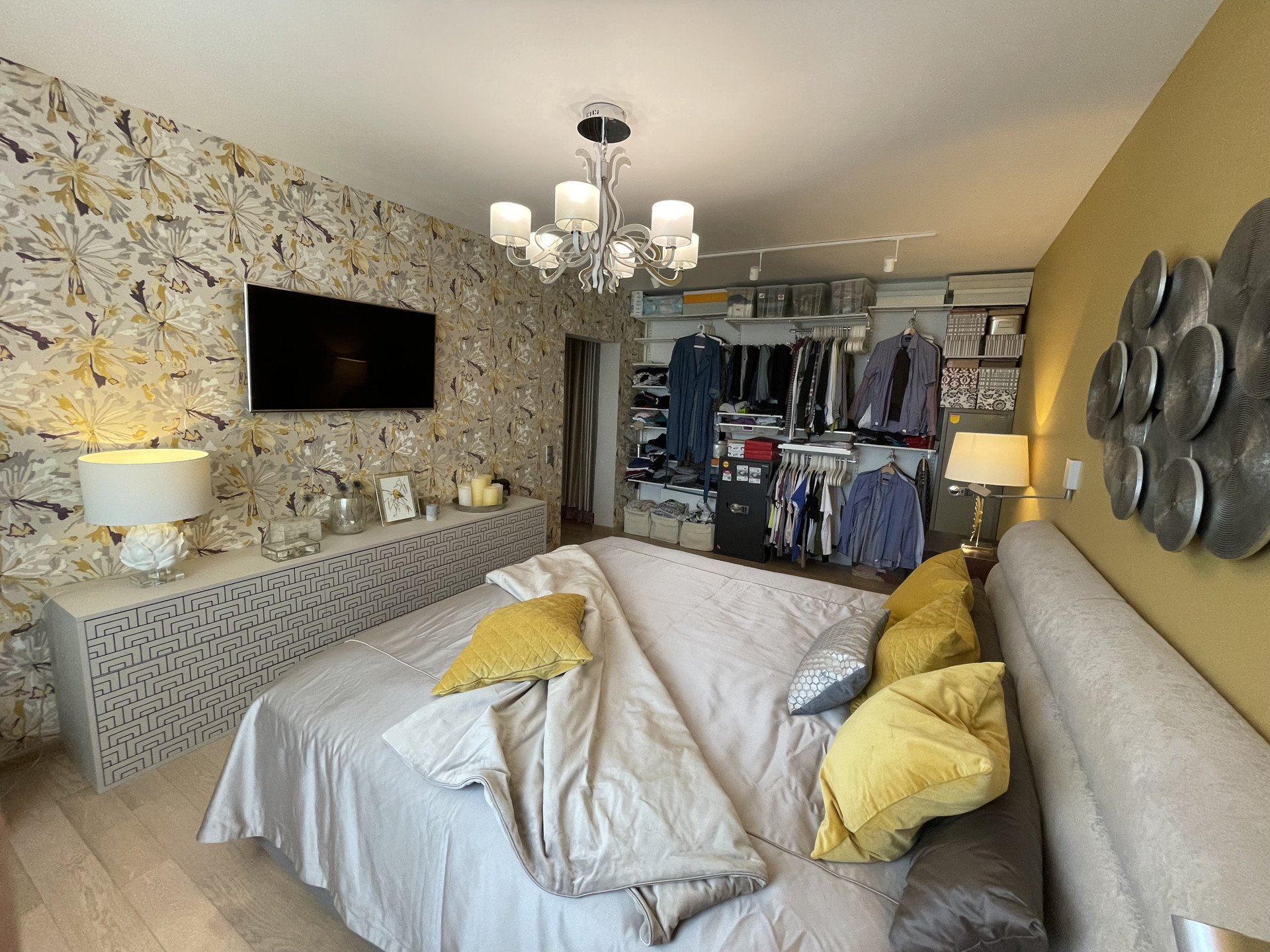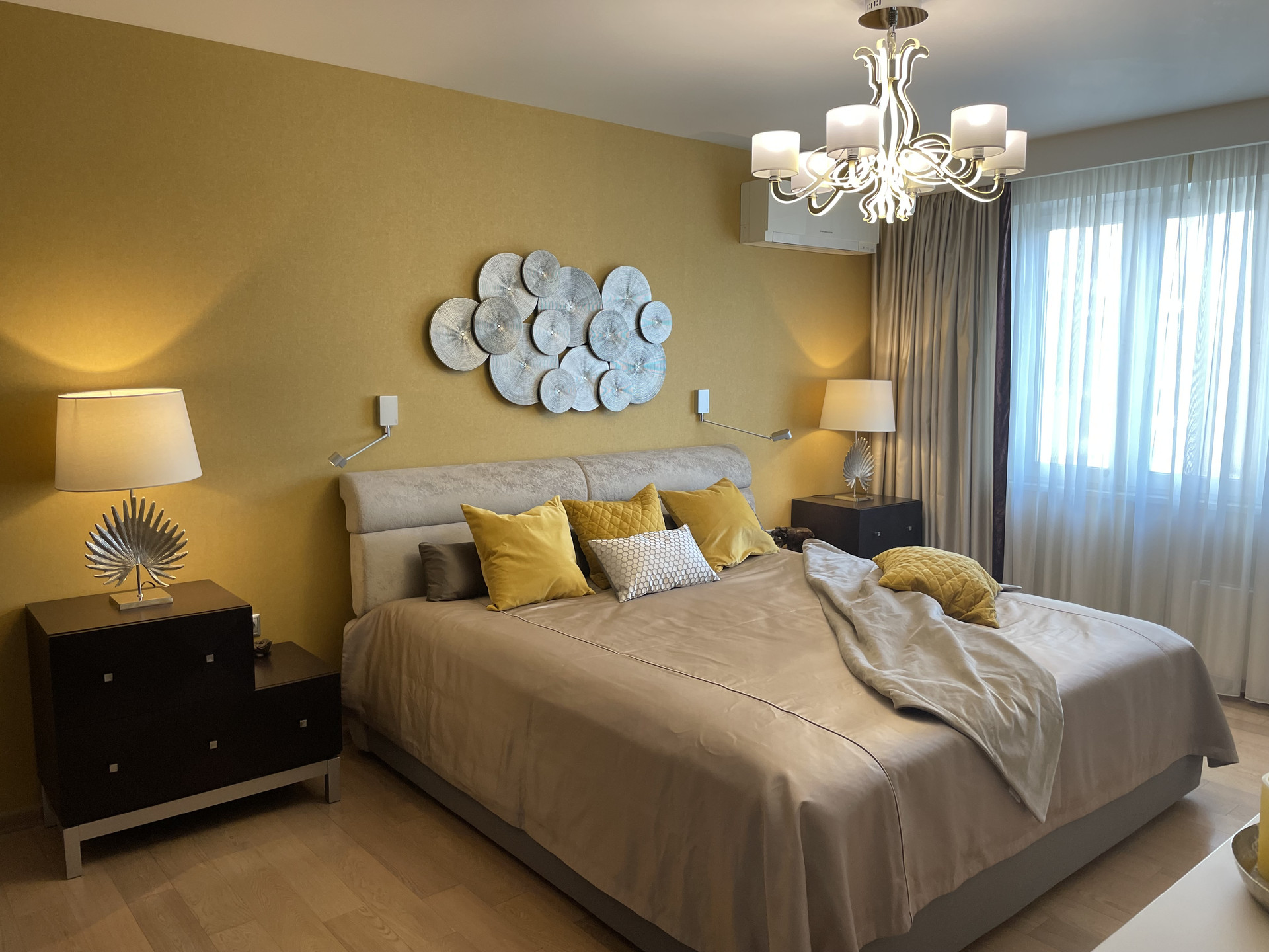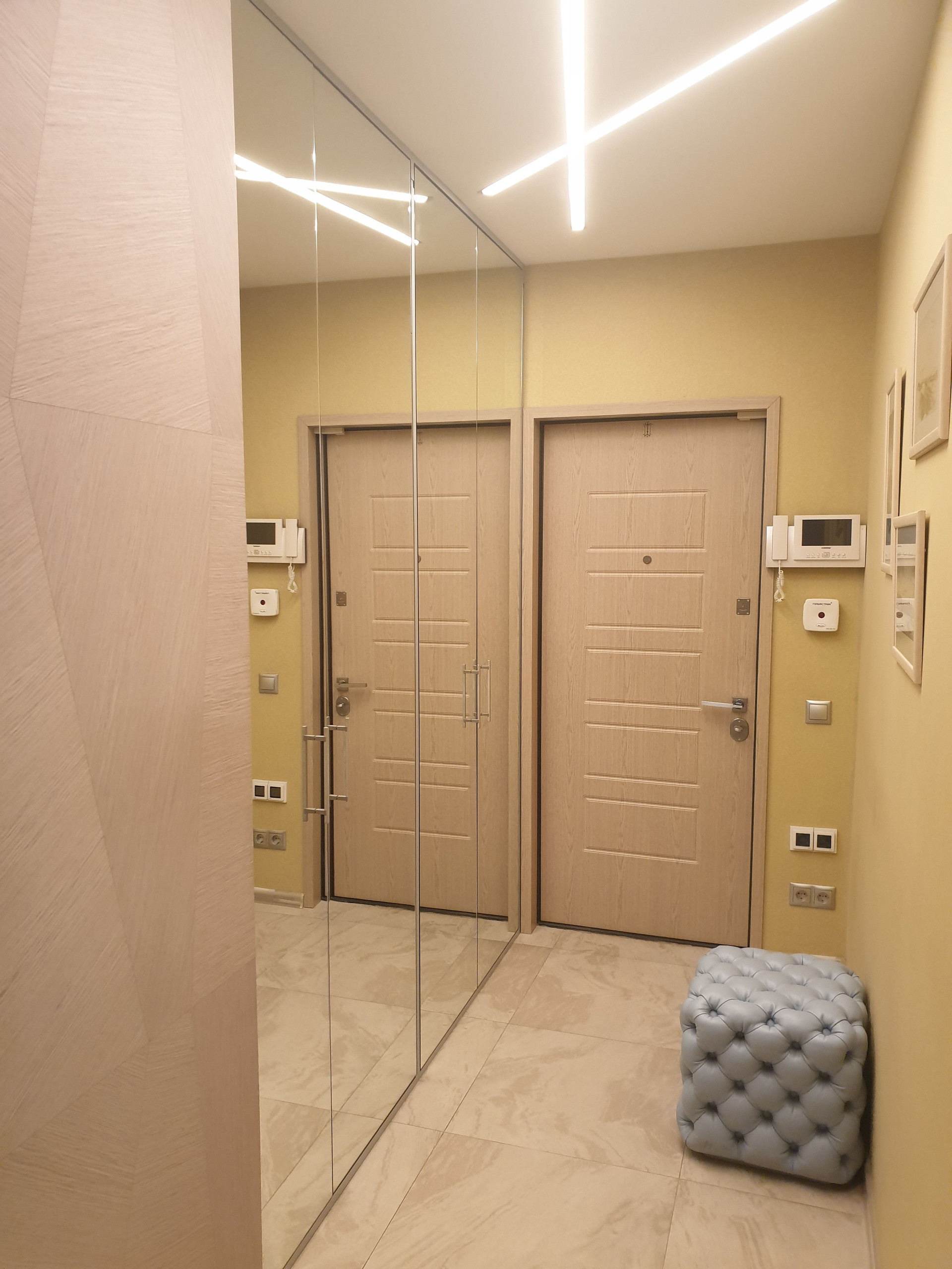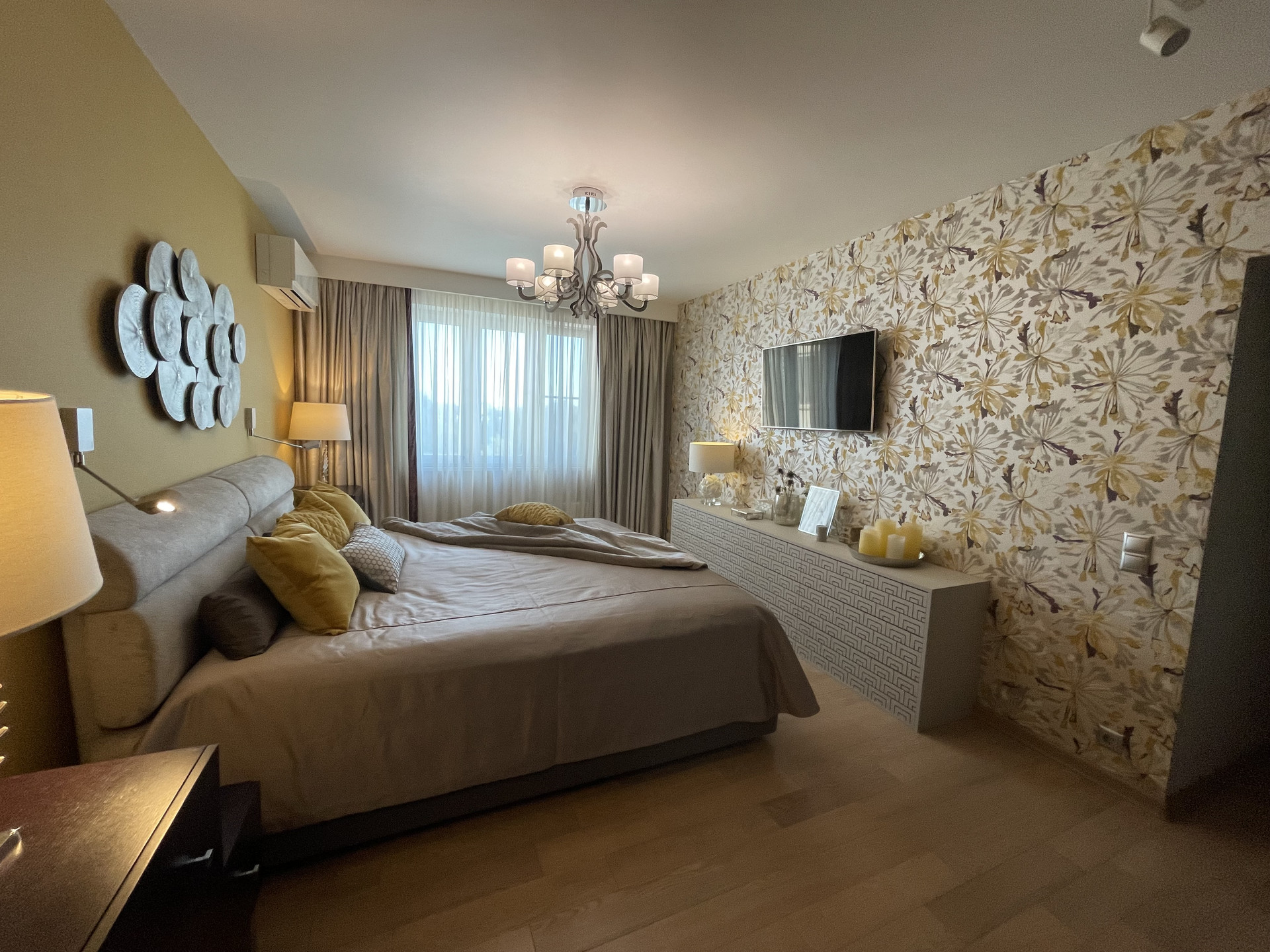 сделана шумоизоляция пола, теплые полы (коридор, санузел и кухня), в остальных помещениях паркетная доска, во всех комнатах установлены инверторные кондиционеры, в гостиной комнате установлена приточная система вентиляции с очисткой поступающего воздуха, потолки оштукатурены и окрашены, балкон остеклен и обустроен, надежная электроразводка с большим количеством розеток, выделена гардеробная, установлена система контроля протечек воды и бойлер для нагрева воды, установлена сигнализация.