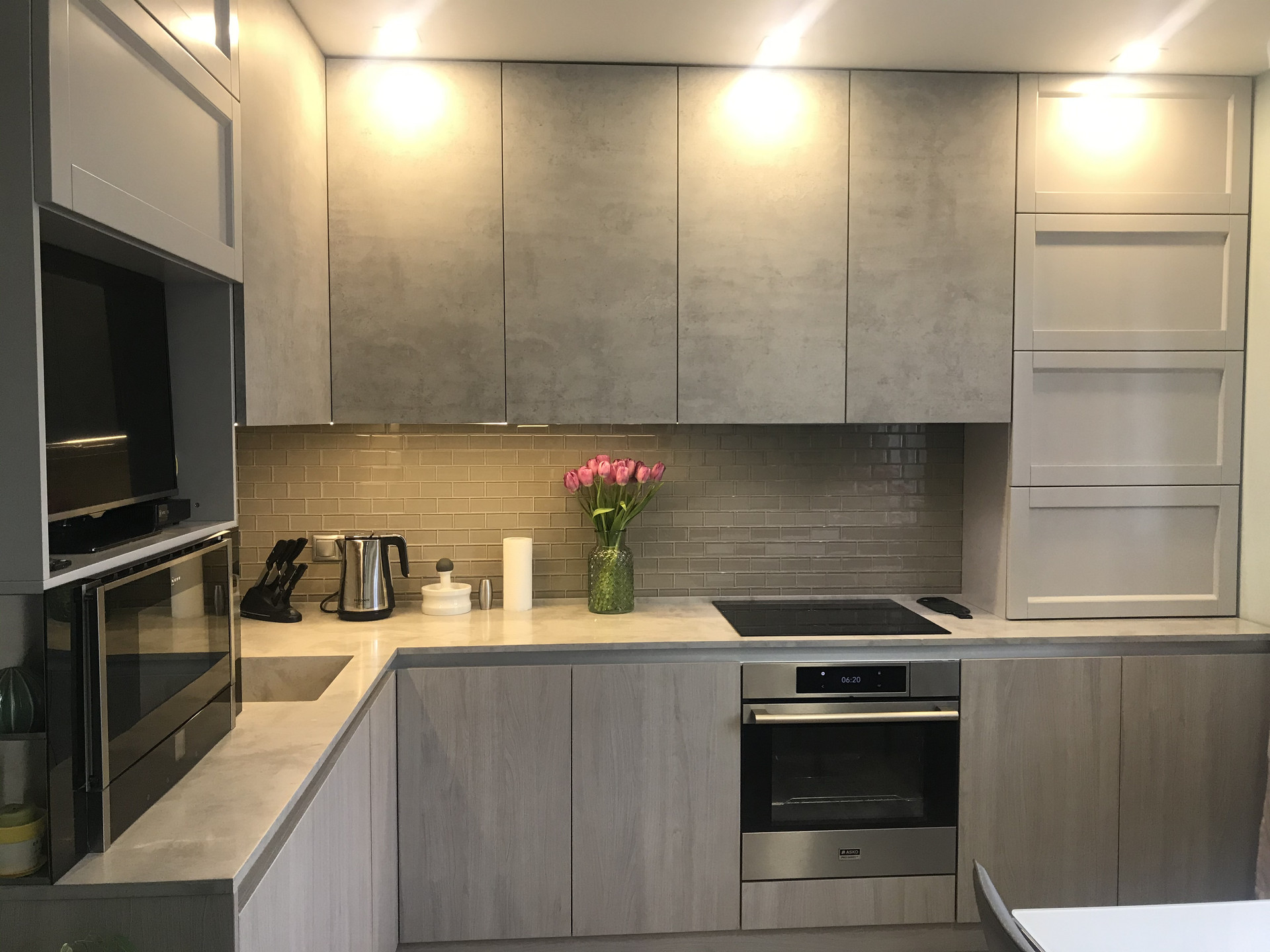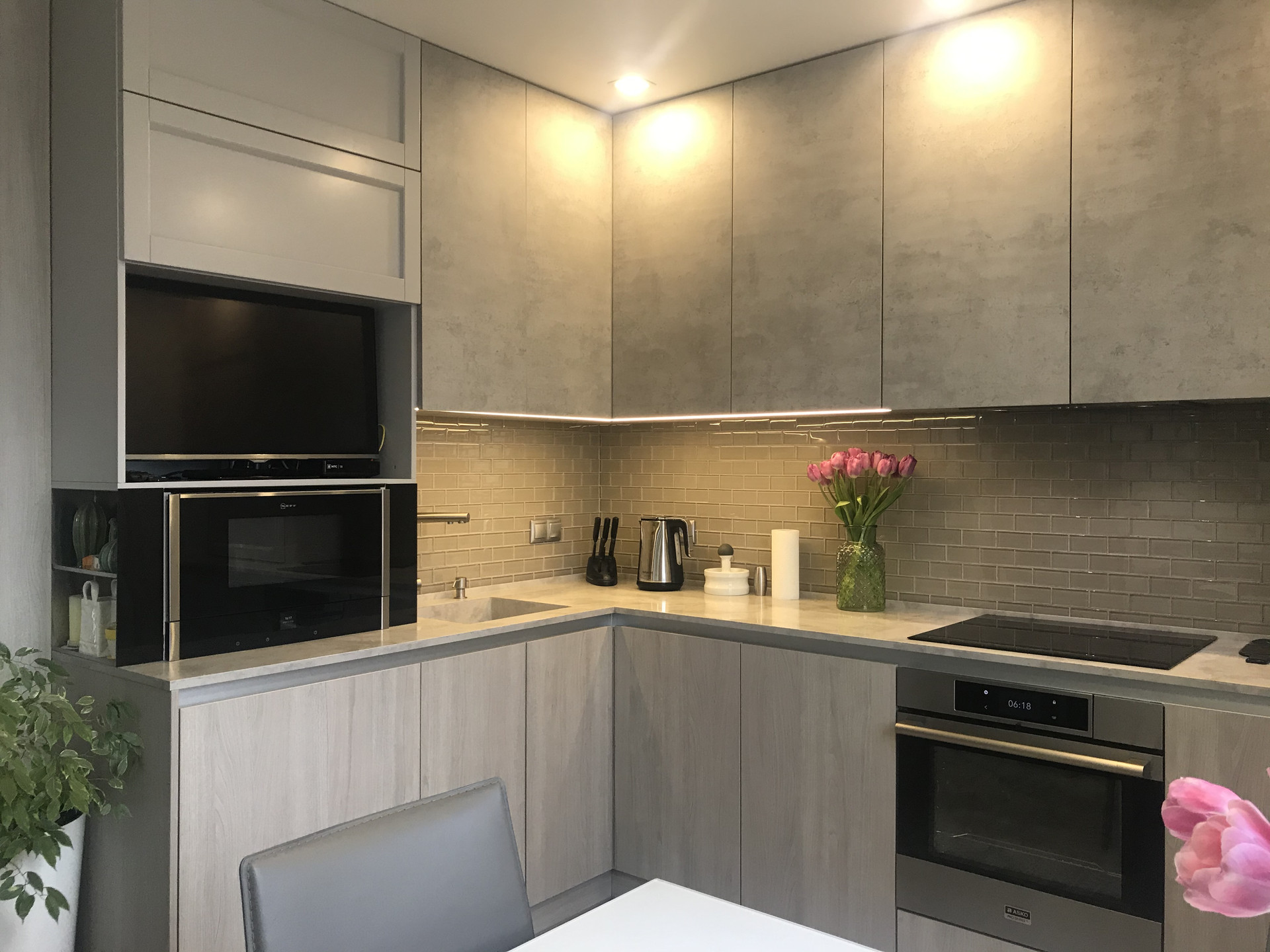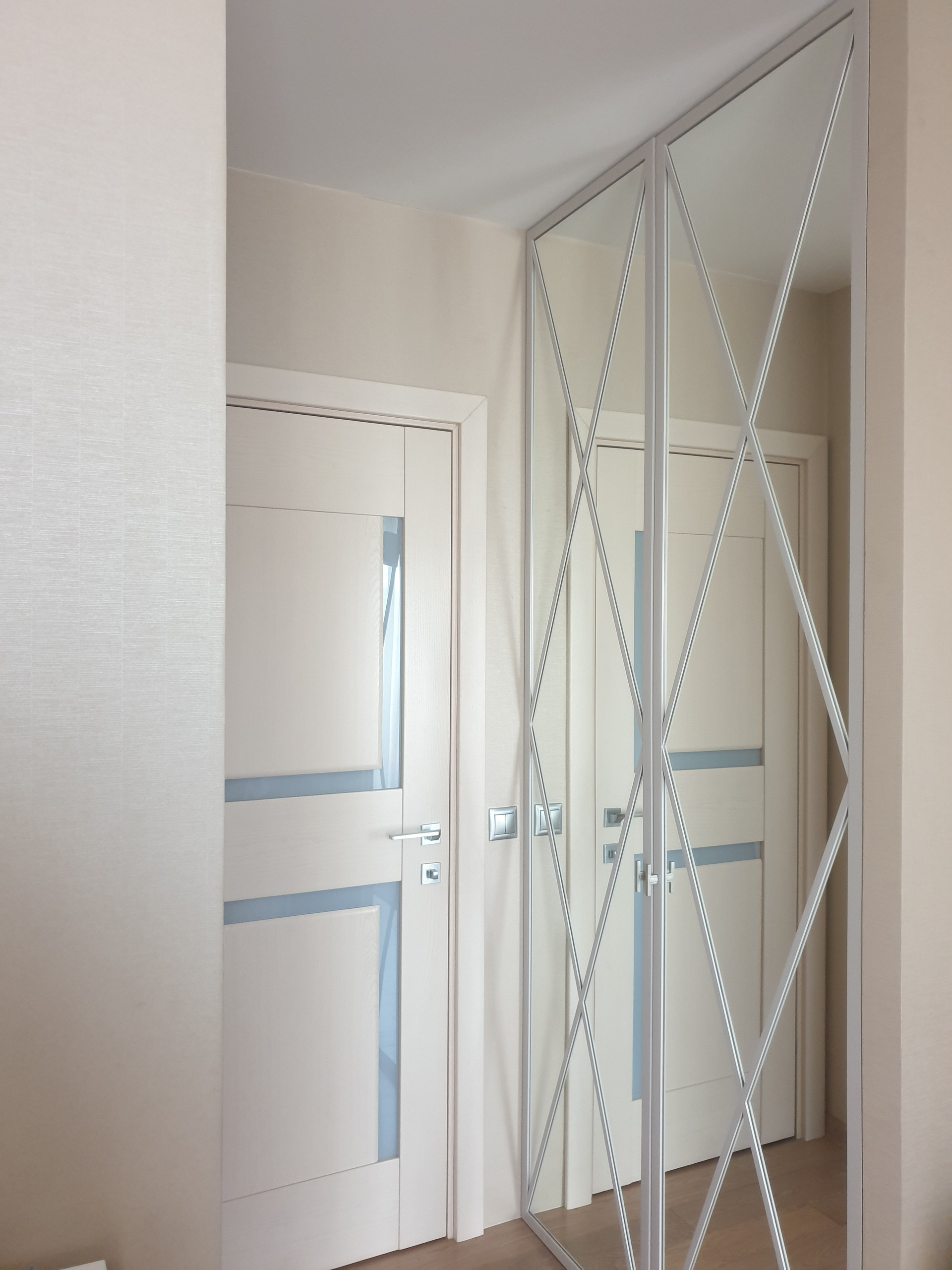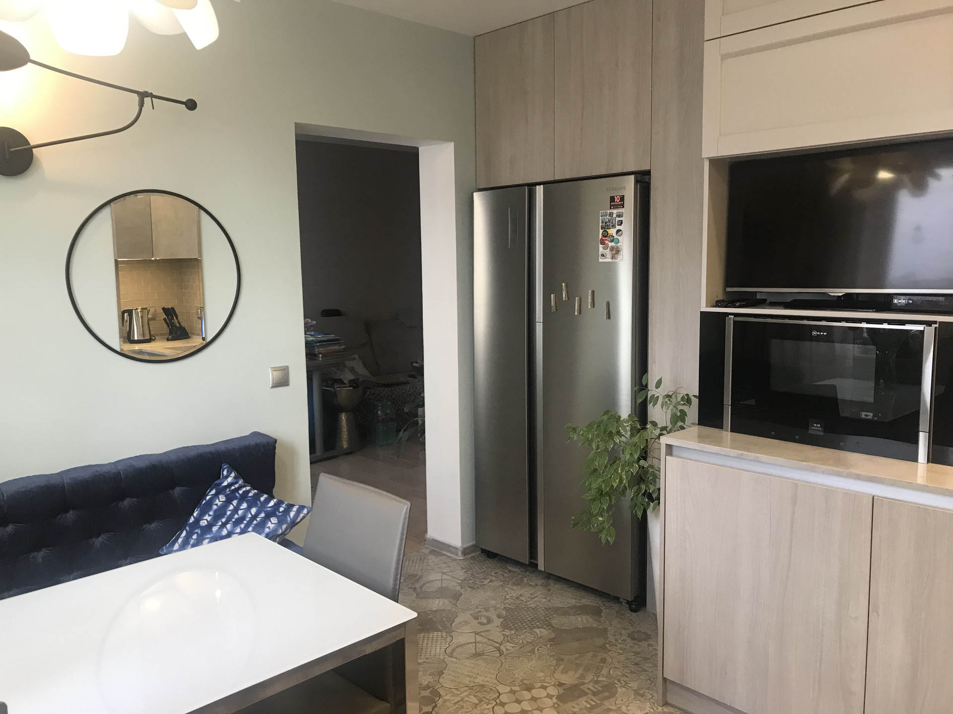 сделана шумоизоляция пола, теплые полы (коридор, санузел и кухня), в остальных помещениях паркетная доска, во всех комнатах установлены инверторные кондиционеры, в гостиной комнате установлена приточная система вентиляции с очисткой поступающего воздуха, потолки оштукатурены и окрашены, балкон остеклен и обустроен, надежная электроразводка с большим количеством розеток, выделена гардеробная, установлена система контроля протечек воды и бойлер для нагрева воды, установлена сигнализация.