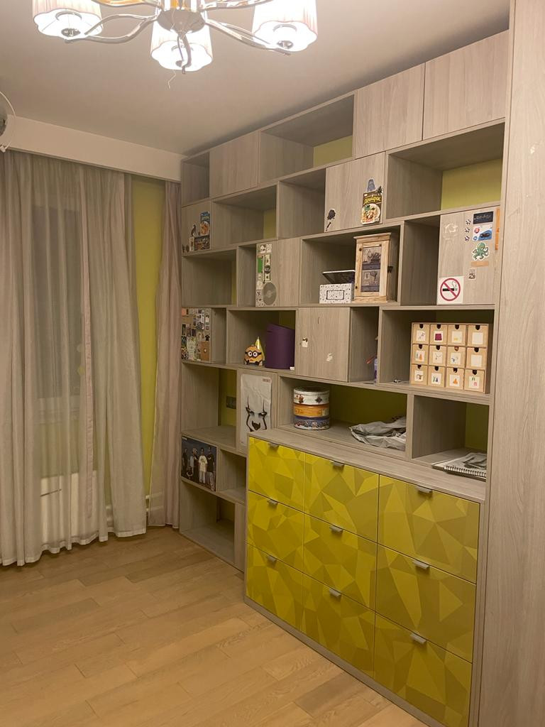 В квартире остается качественная, хорошо спроектированная кухня с каменной столешницей, интегрированной каменной мойкой, фильтром питьевой воды, встроенной бытовой техникой (варочная панель, духовой шкаф, посудомоечная машина, вытяжка), вместительные встроенные шкафы в прихожей и гостиной, изготовленные по индивидуальному проекту, встроенный шкаф в детской комнате, шкаф и стеллажная система хранения во второй детской комнате, система хранения в гардеробной. .