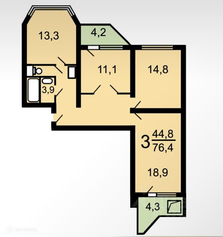 Жилая площадь 43.8 м2