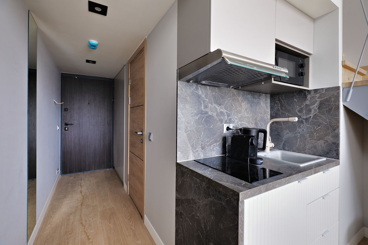Видовая студия с панорамными окнами и высокими потолками от  3,8  м. Дизайнерская отделка в современном стиле, встроенная кухня.