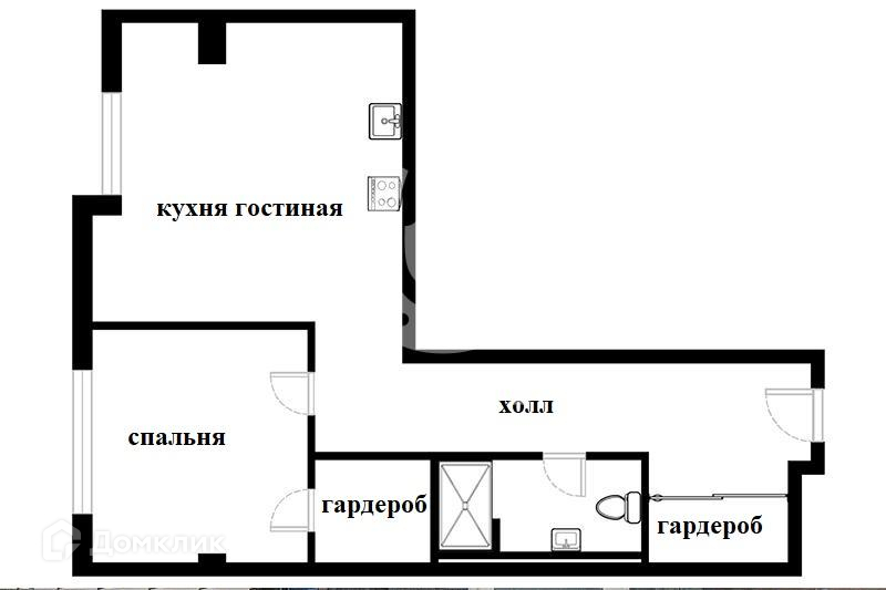 Планировочное решение: кухня-гостиная, спальня с гардеробной, санузел с душевой, холл.