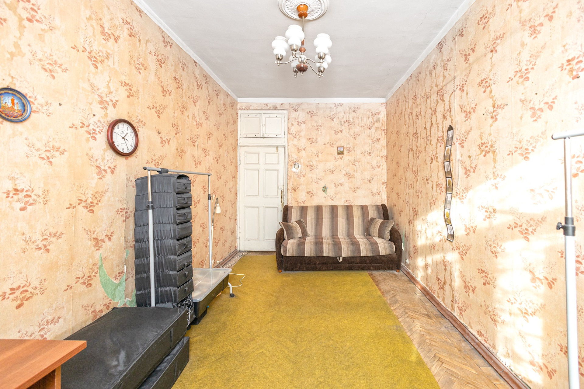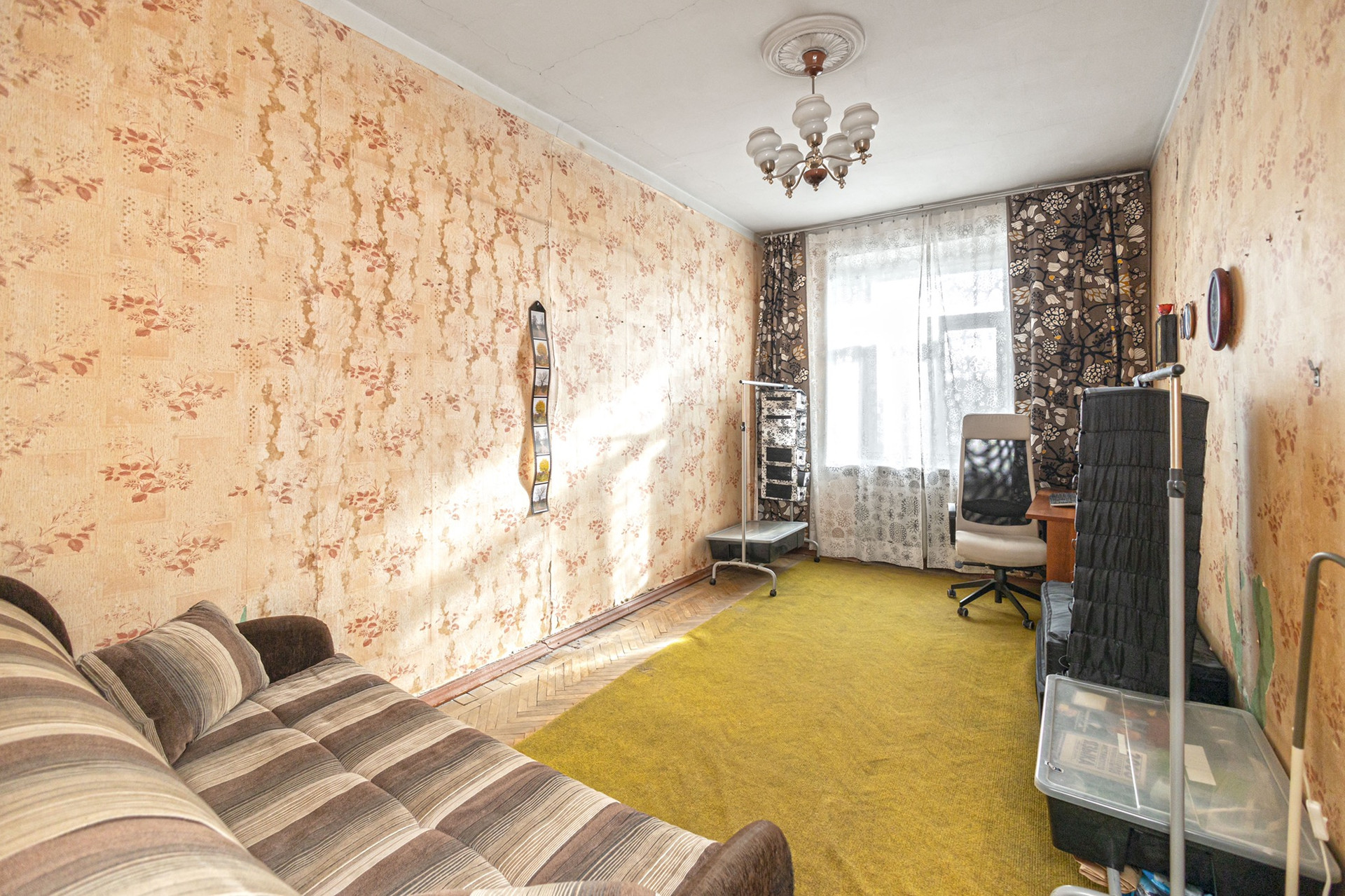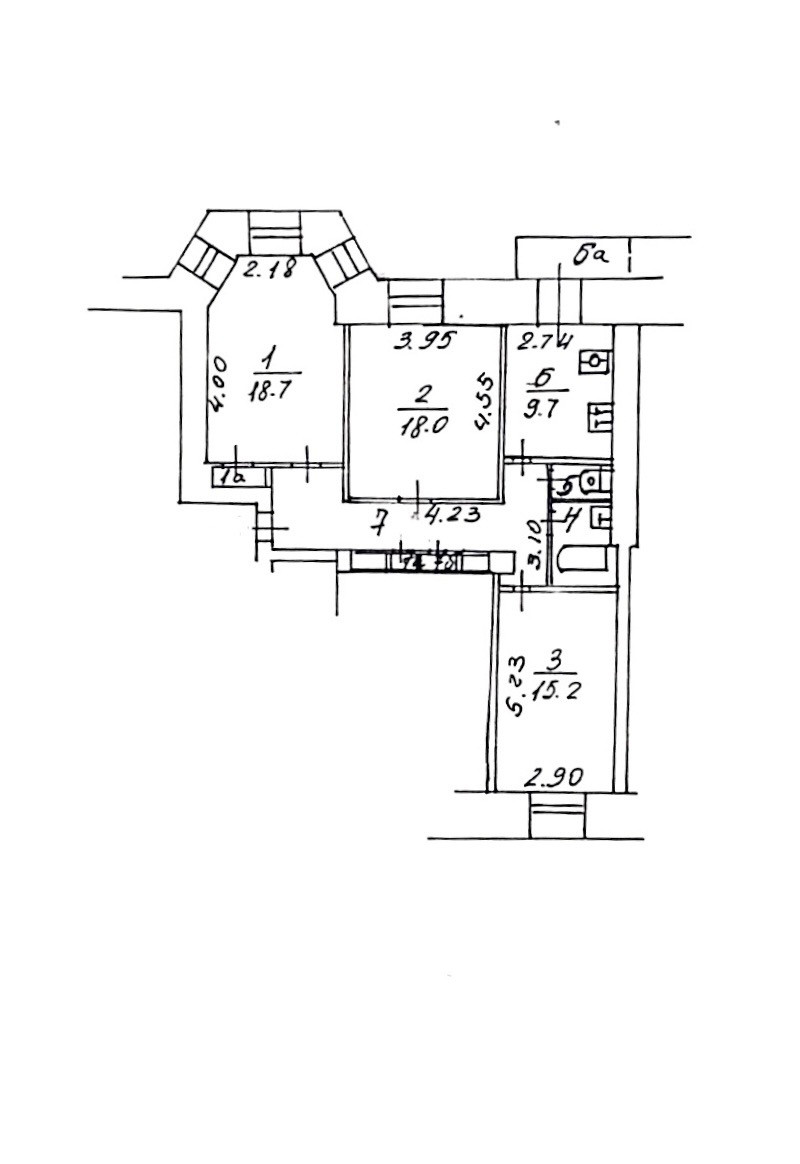 Квартира требует капитального ремонта. Три изолированные комнаты 18/18,7/15,2 м2, большая комната с эркером. Кухня 9,7 м2 с выходом на балкон. С/у раздельный. Просторный коридор. Перепланировок не было.