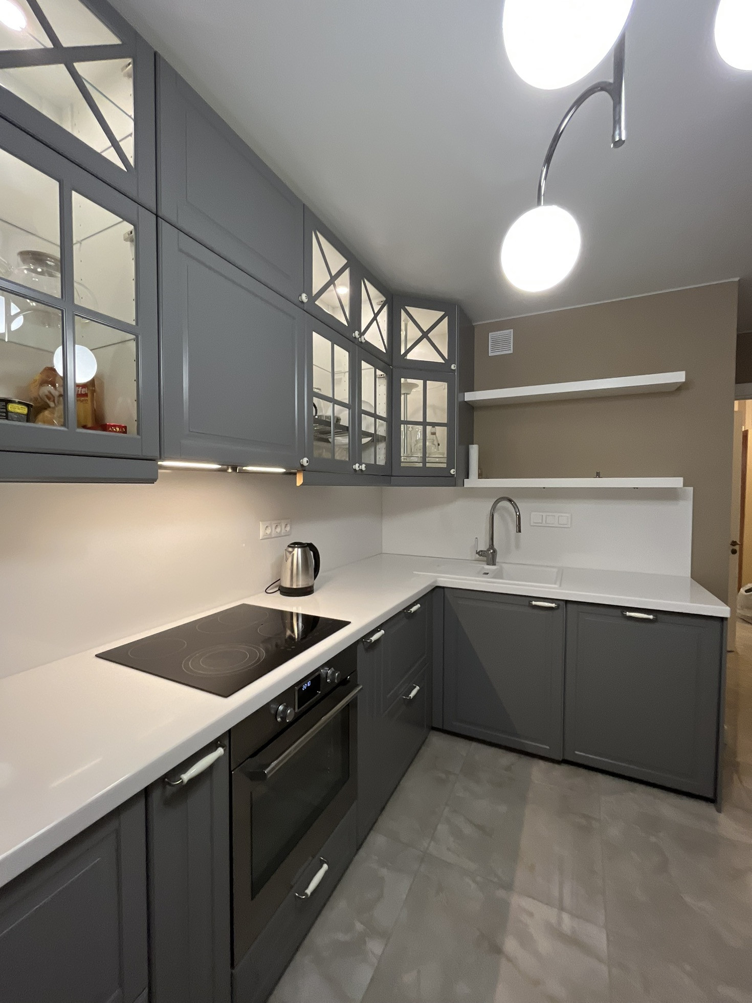 Квартира оборудована кухней Икеа под ключ. Холодильник, плита, духовка, вытяжка, посудомоечная машина, удобные шкафчики с освещением и столешница из камня.