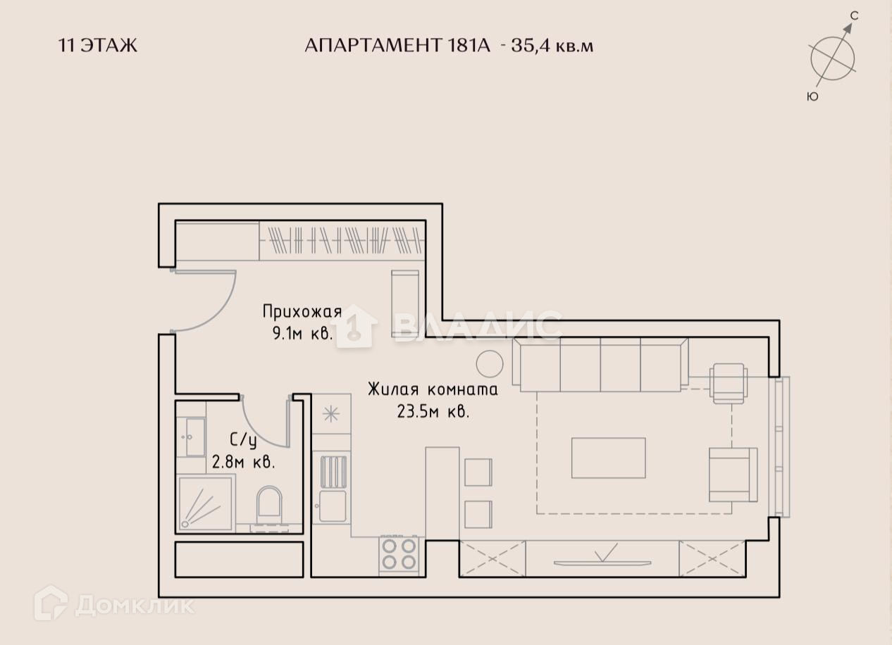 Общая площадь 35.4 м2