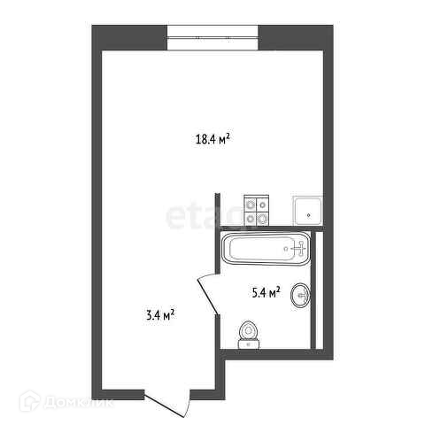 По замыслу застройщика в ней кухня-гостиная 18,4 кв. м, прихожая 3,4 кв. м с возможностью встроить удобную систему хранения, совмещённый санузел 5,4 кв. м, где прекрасно разместится полноценная ванна.