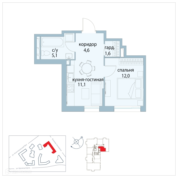 1-комнатная квартира, 34.2 м2, этаж 26 / 27, на продажу в Москве, улица Золоторожский Вал, 11с20