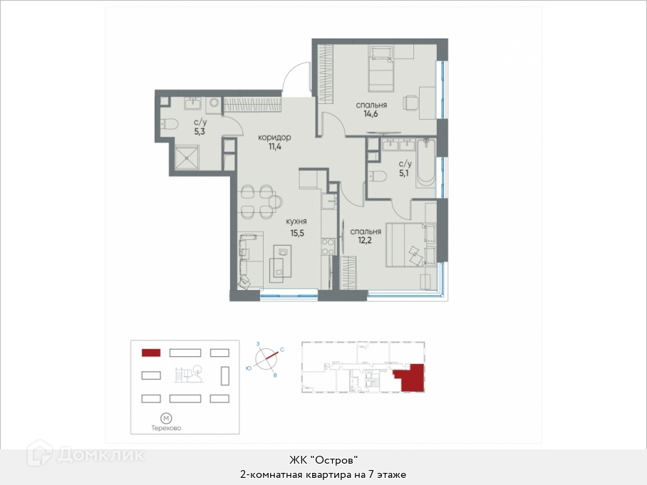 Корпус 5.3 в ЖК "Остров", в котором расположена квартира, будет построен в 2025 году. Дом монолитный, в корпусе всего один подъезд, есть 2 грузовых лифта.