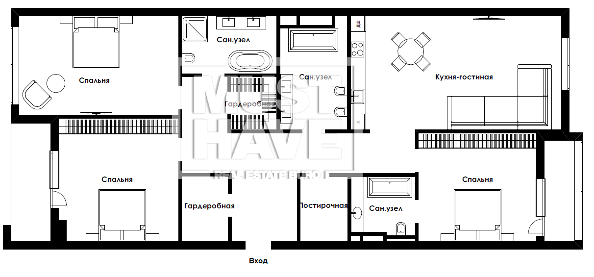 По плану возможно обустроить гостиную – кухню – столовую, две спальни со своими ванными комнатами, гостевую спальню, из двух спален есть выход на балконы, ванную комнату, гардеробную комнату, хозяйственную комнату и гостевой санузел.