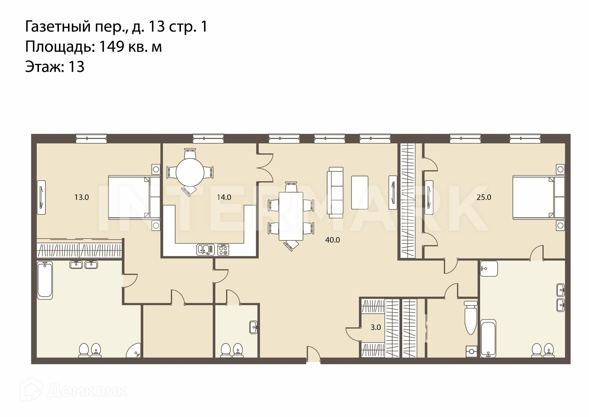 3-комнатная квартира, 149 м2, этаж 13 / 14, на продажу в Москве, Газетный переулок, 13
