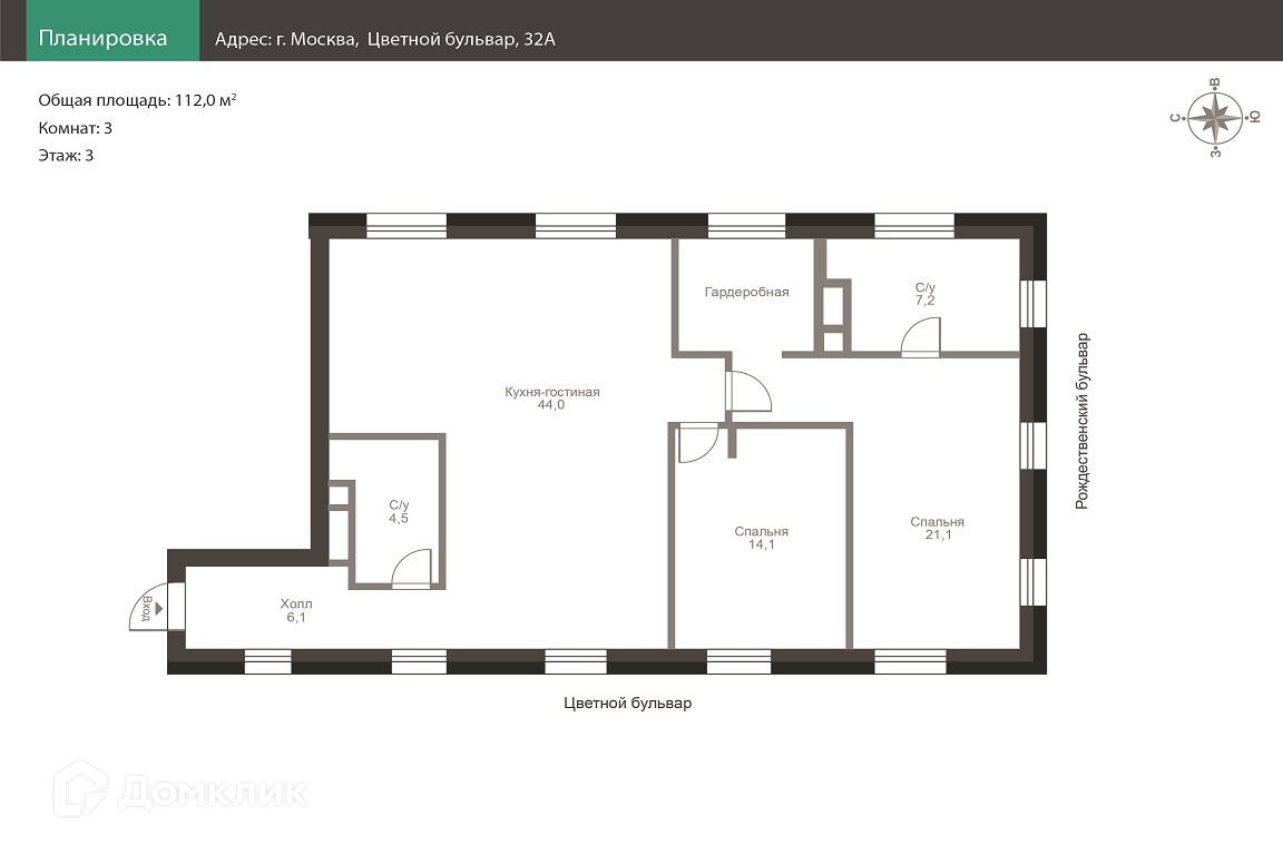 3-комнатная квартира, 112 м2, этаж 3 / 22, на продажу в Москве, Цветной бульвар, 32А