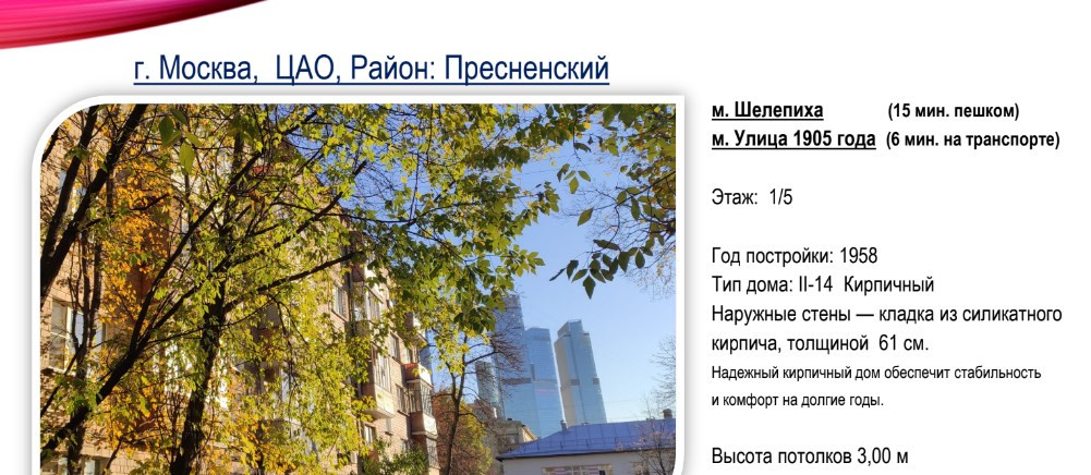 Информация о доме: Год постройки: 1958 Индивидуальный проект 01-П3, отличная шумо- и теплоизоляция, толщина стен 61 см, Высота потолков 3 м. Высота этажа 3,2 м Перекрытия: Железобетонные Каркас: Кирпичный Стены: Кирпичные Фундамент: Ленточный Износ дома: 42.9% Категория: муниципальный Квартир: 45 Проживает: 141 человек Этажей всего: 5 Подвальных этажей: 1 Высота потолков: 300 см Подъездов: 3 Управляющая компания: ГБУ Жилищник Пресненского района Транспортная доступность: м. Шелепиха - 15 мин. пешком / ж/д Тестовская - 15 мин. пешком. Удобное транспортное сообщение, выезд на TTK.