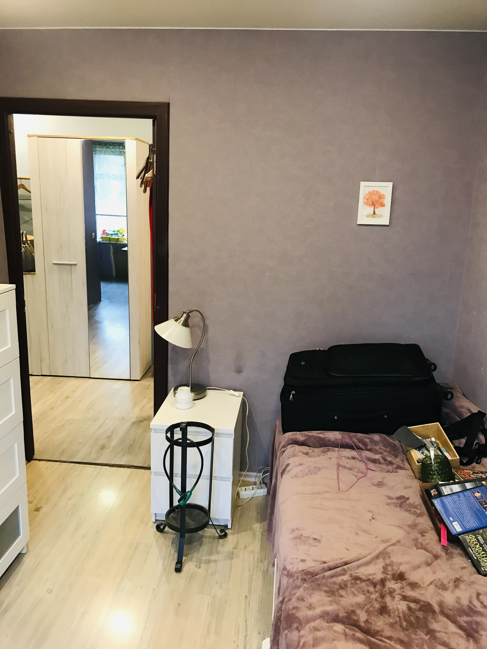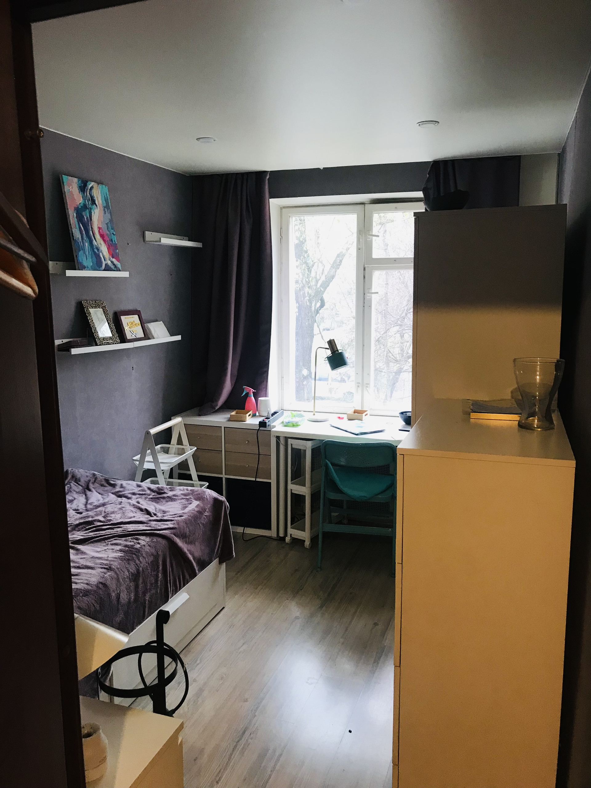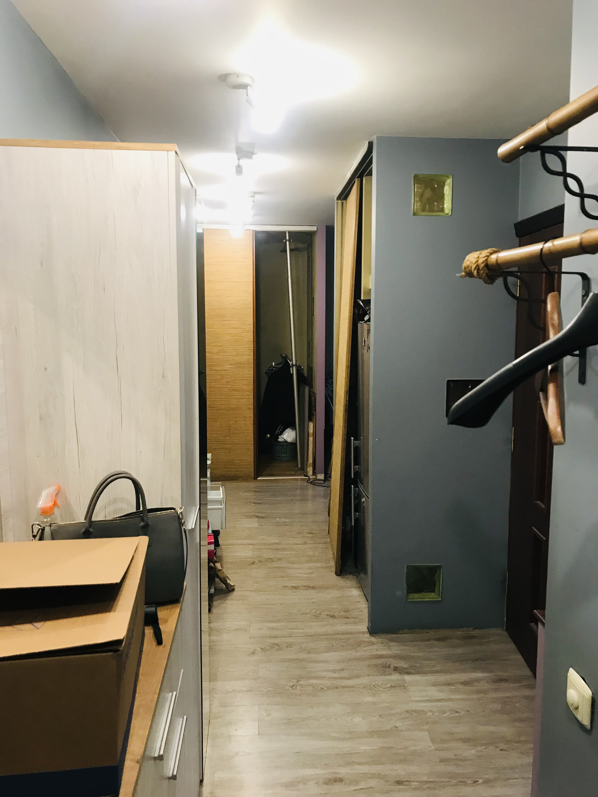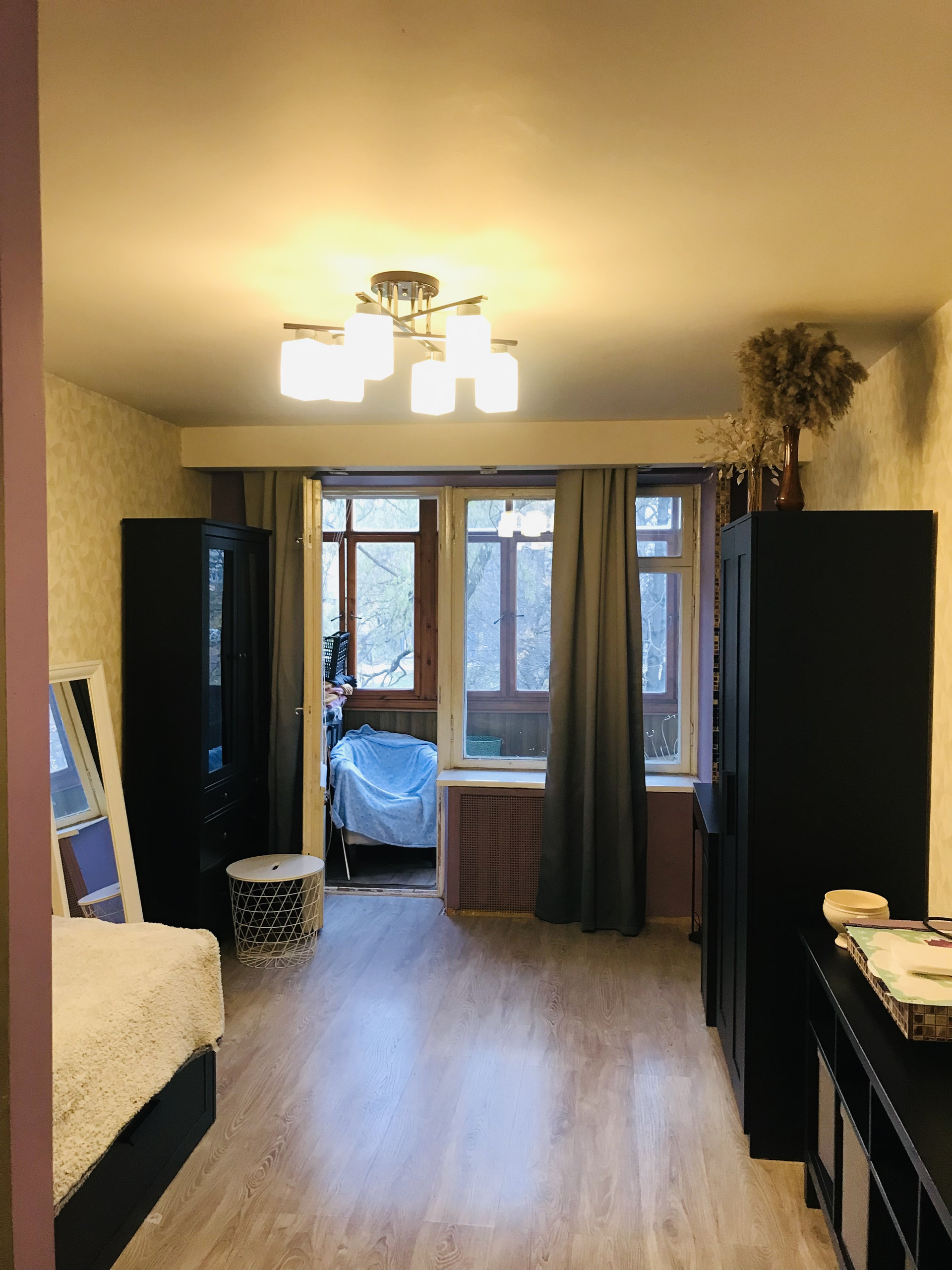 Из важных моментов квартиры стоит отметить удобное пространство. Для комфортного проживания создано несколько важных элементов, как то гардеробная и просторный вход в гостинную,которая заканчивается милым,застекленным балкончиком с окнами во двор.