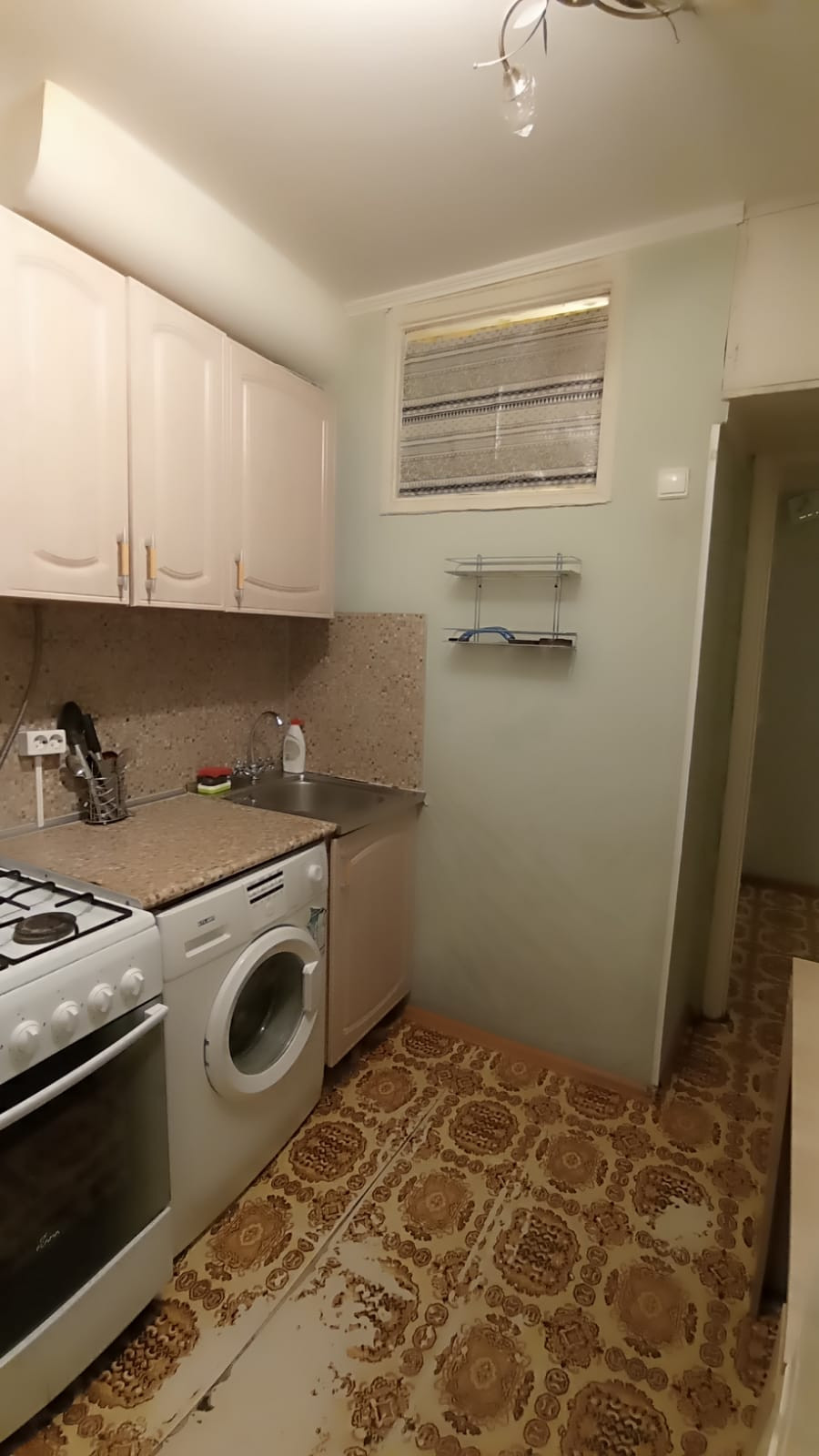 В квартире новая кухня, микроволновая печь, чайник, кровать, шкаф, телевизор, стиральная машинка, все остается в квартире.