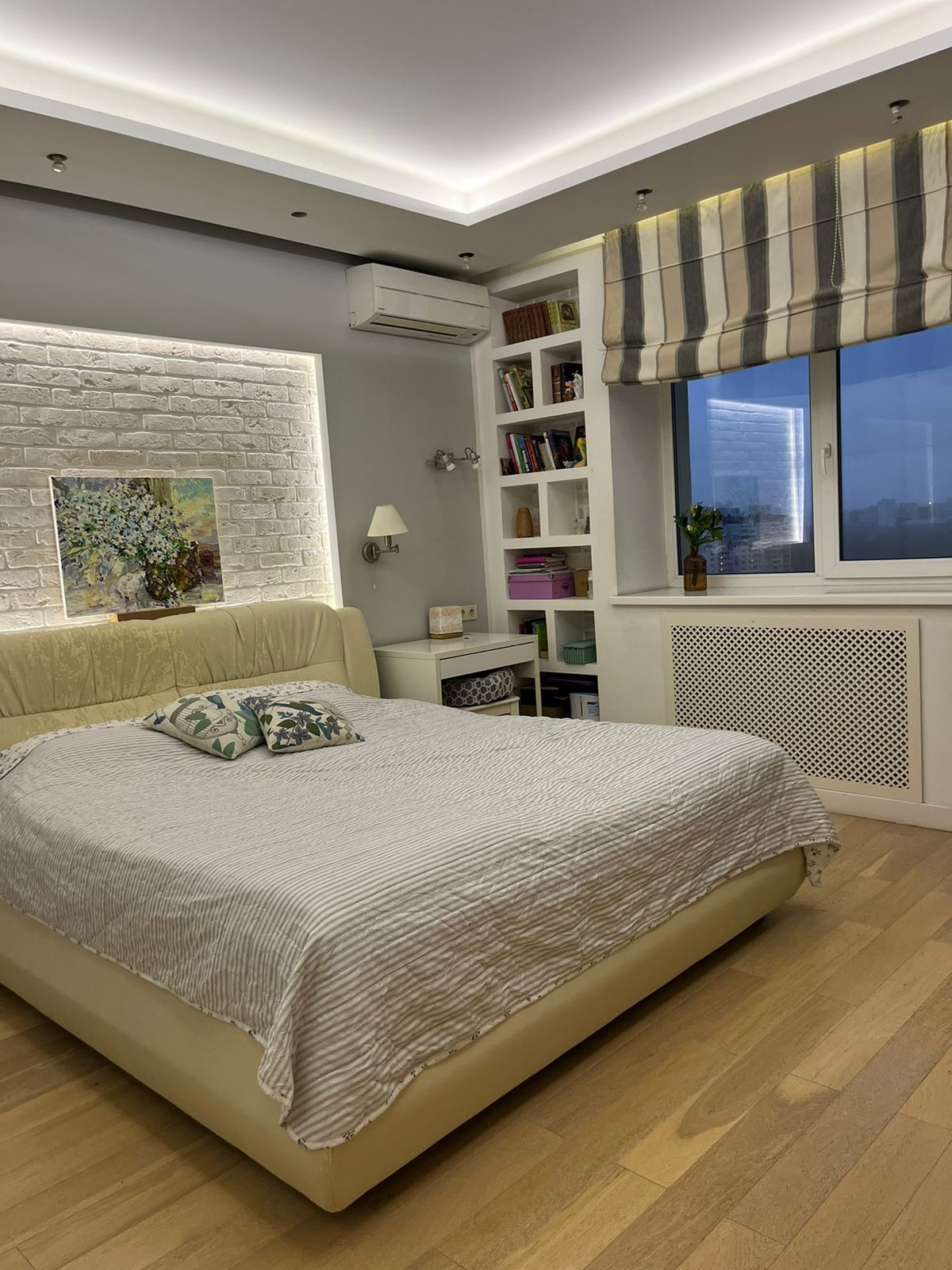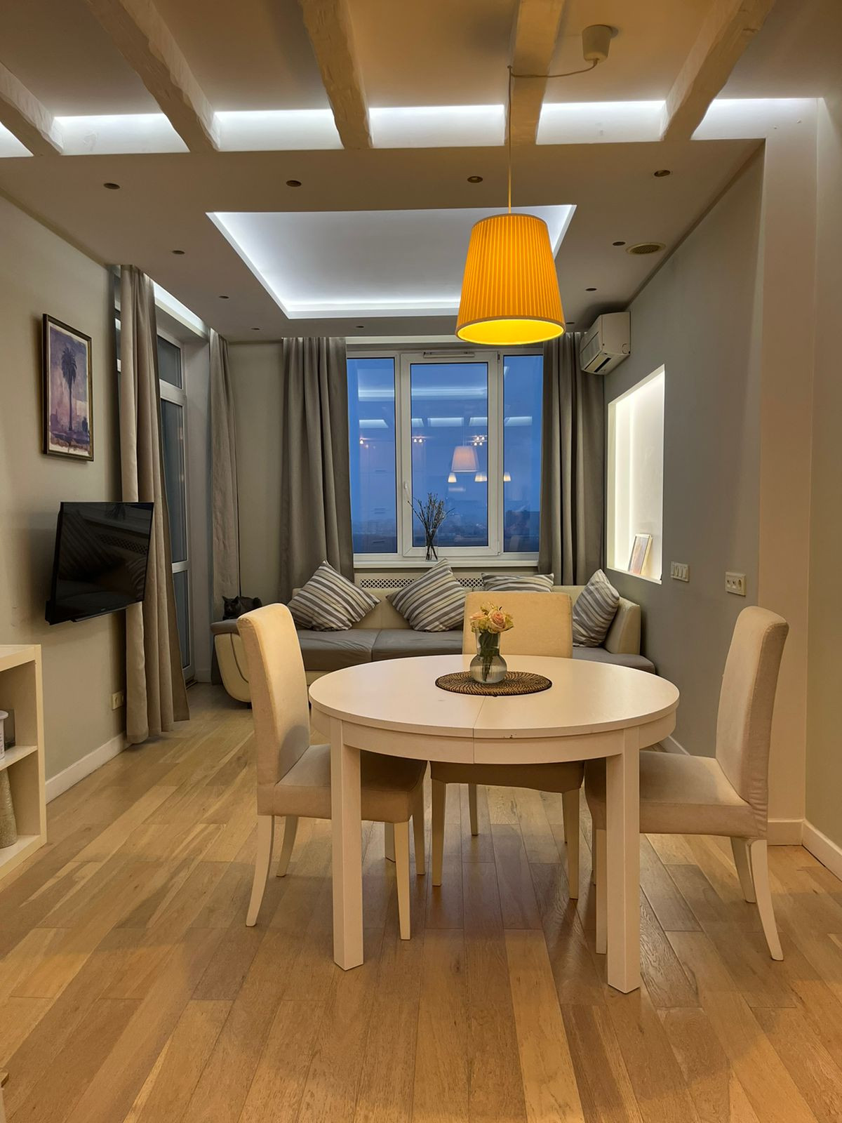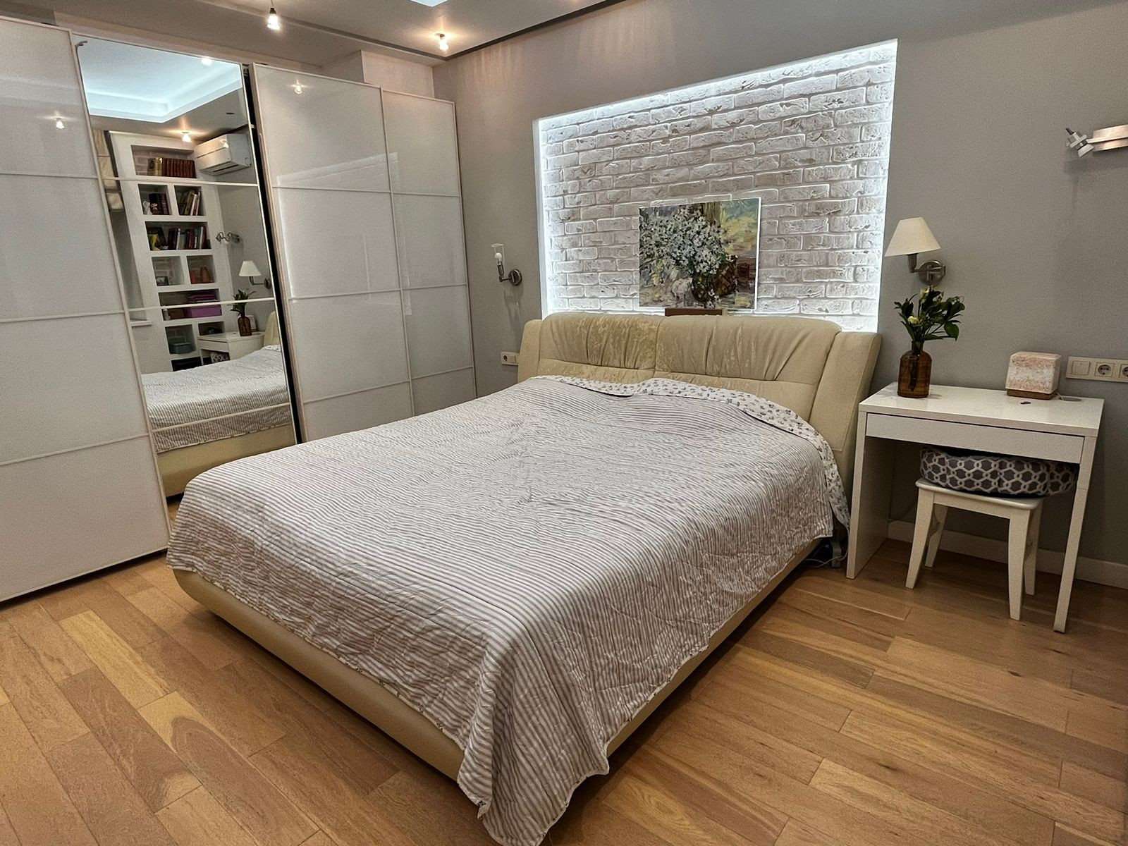 В квартире индивидуальная планировка, дизайнерский ремонт. 2 отдельные спальни (18 и 16 кв.м), уютная гостиная с большой светлой кухней, 2 санузла (ванная и душ), небольшая гардеробная, просторная прихожая и французский балкон.