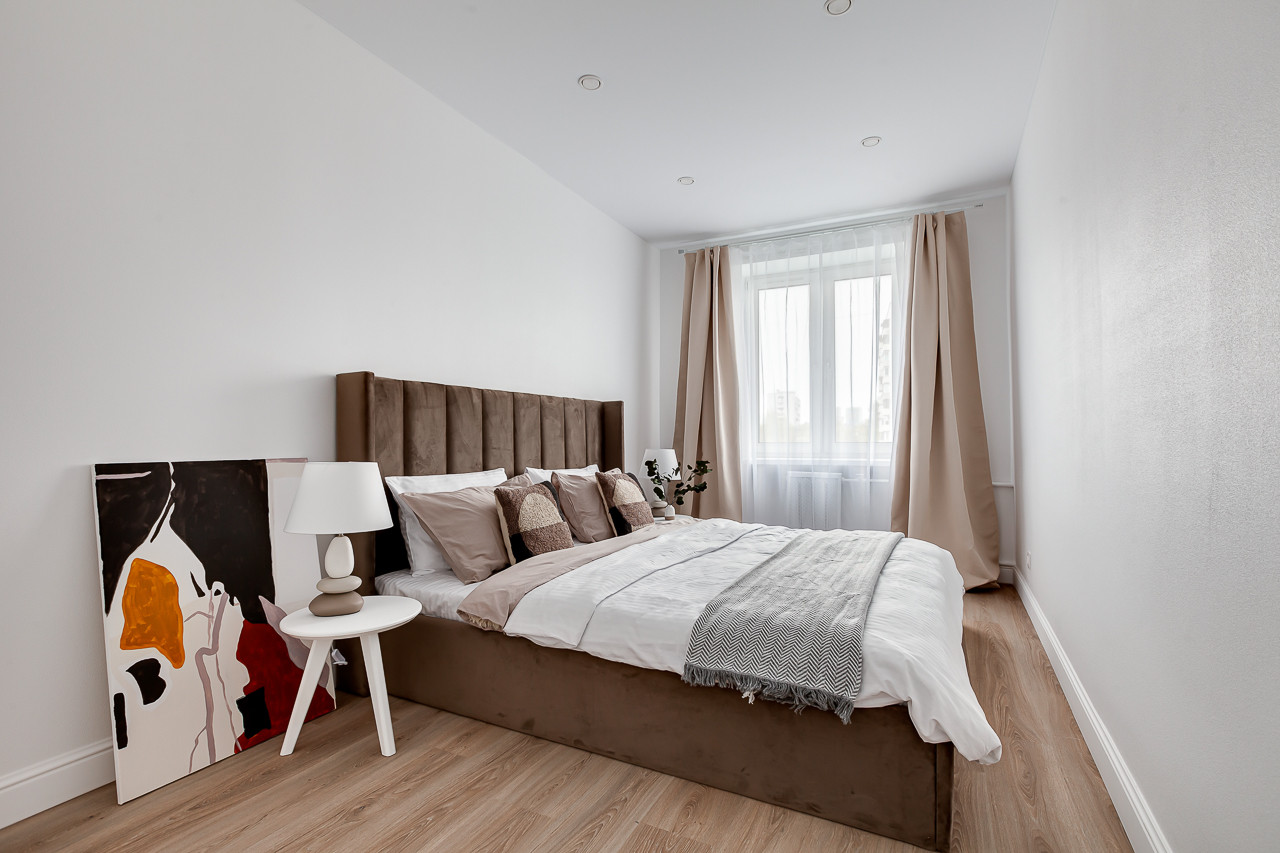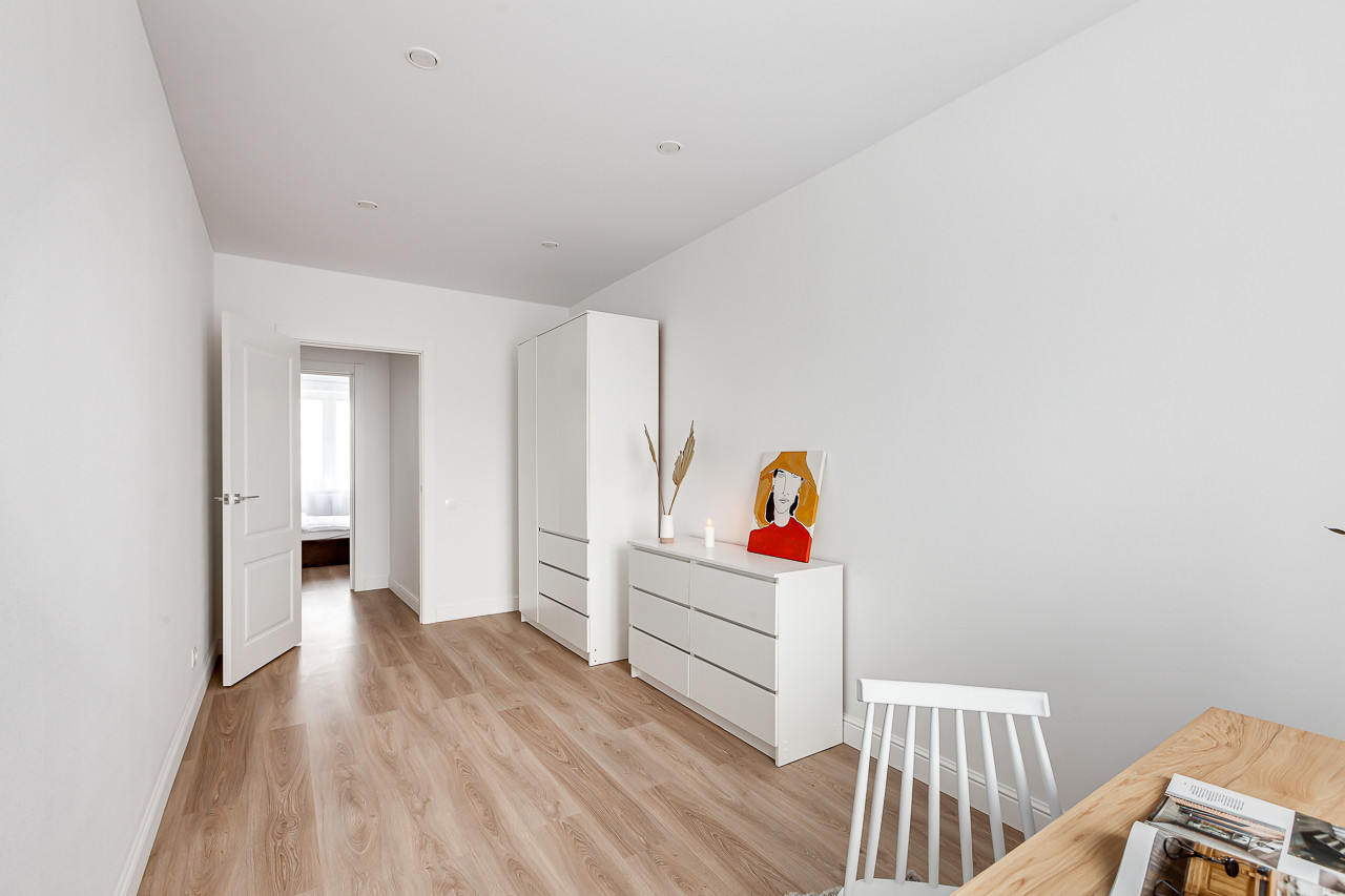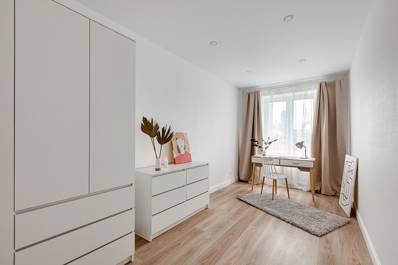 Комнаты изолированы - гостиная 13,2 с выходом на застекленный балкон. В гостиной располагается новый диван, журнальный столик и тумба. Две спальни: 11.2 с гардеробной, шикарной двуспальной кроватью, прикроватным столиком и 13.2, с комодом, письменным столом и шкафом. Кухня 6,3 кв.м, новый кухонный гарнитур, духовой шкаф и варочная панель, также стильным столом и стульями. Отделка: обои под покраску, выкрашены в белый цвет, ламинат. Новый ремонт в санузле.