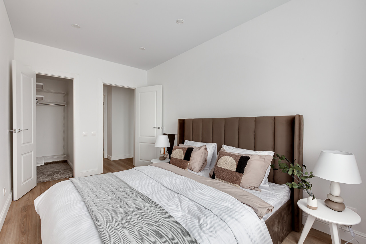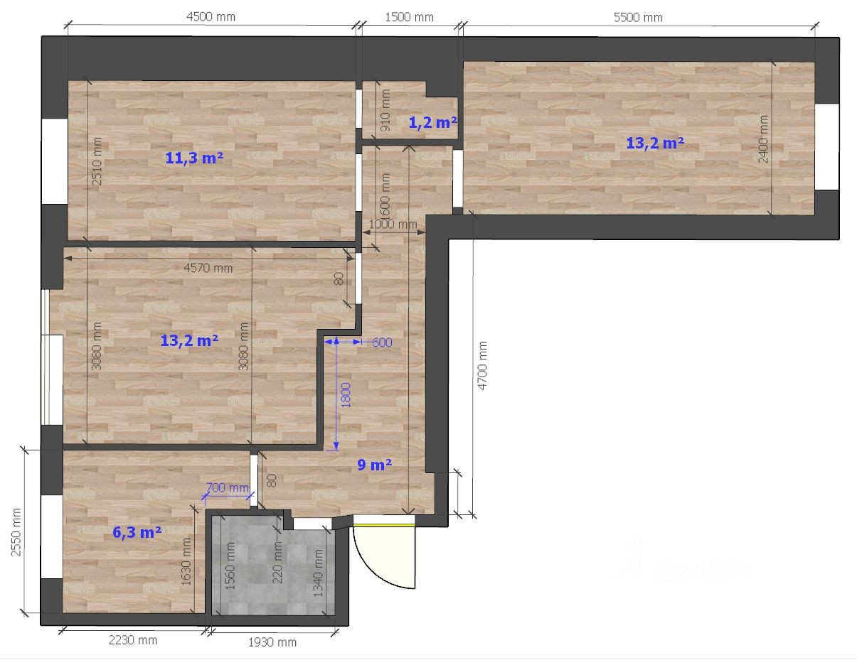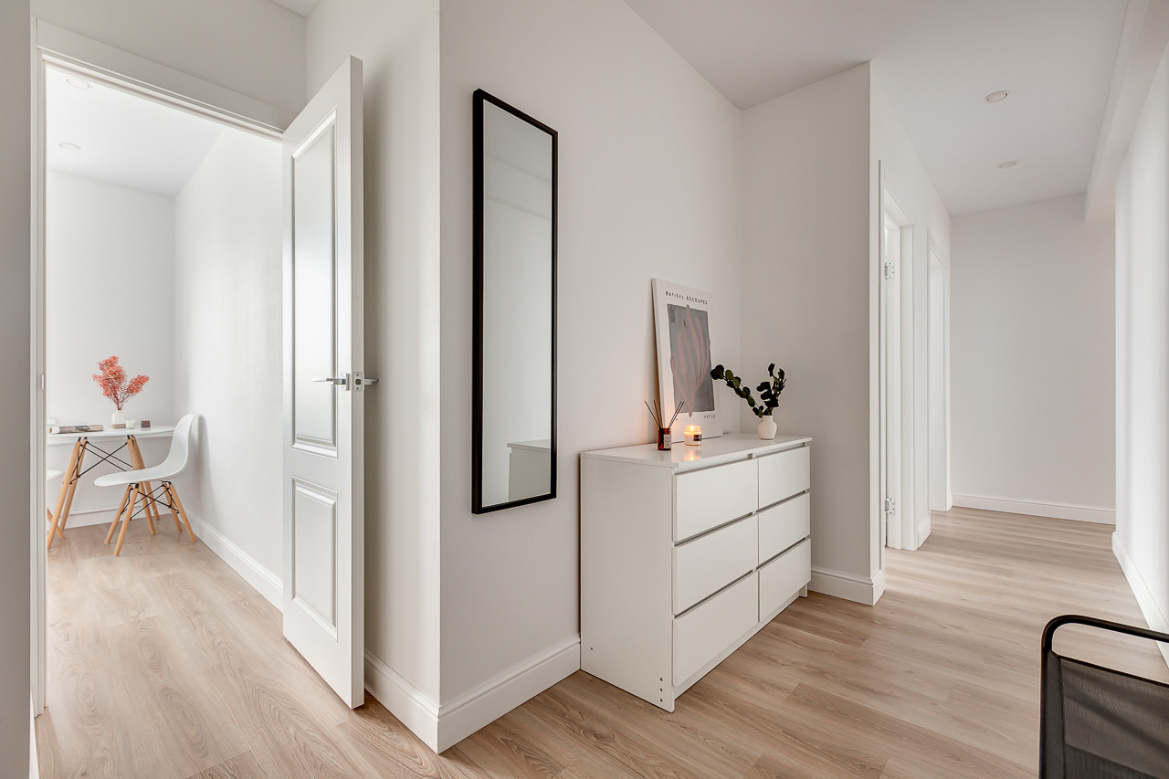 Комнаты изолированы - гостиная 13,2 с выходом на застекленный балкон. В гостиной располагается новый диван, журнальный столик и тумба. Две спальни: 11.2 с гардеробной, шикарной двуспальной кроватью, прикроватным столиком и 13.2, с комодом, письменным столом и шкафом. Кухня 6,3 кв.м, новый кухонный гарнитур, духовой шкаф и варочная панель, также стильным столом и стульями. Отделка: обои под покраску, выкрашены в белый цвет, ламинат. Новый ремонт в санузле.