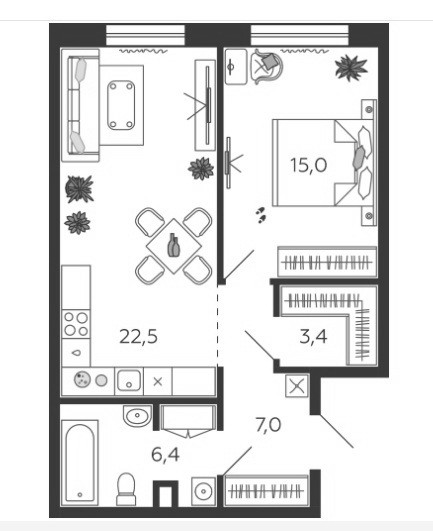 Общая площадь 54.3 м2