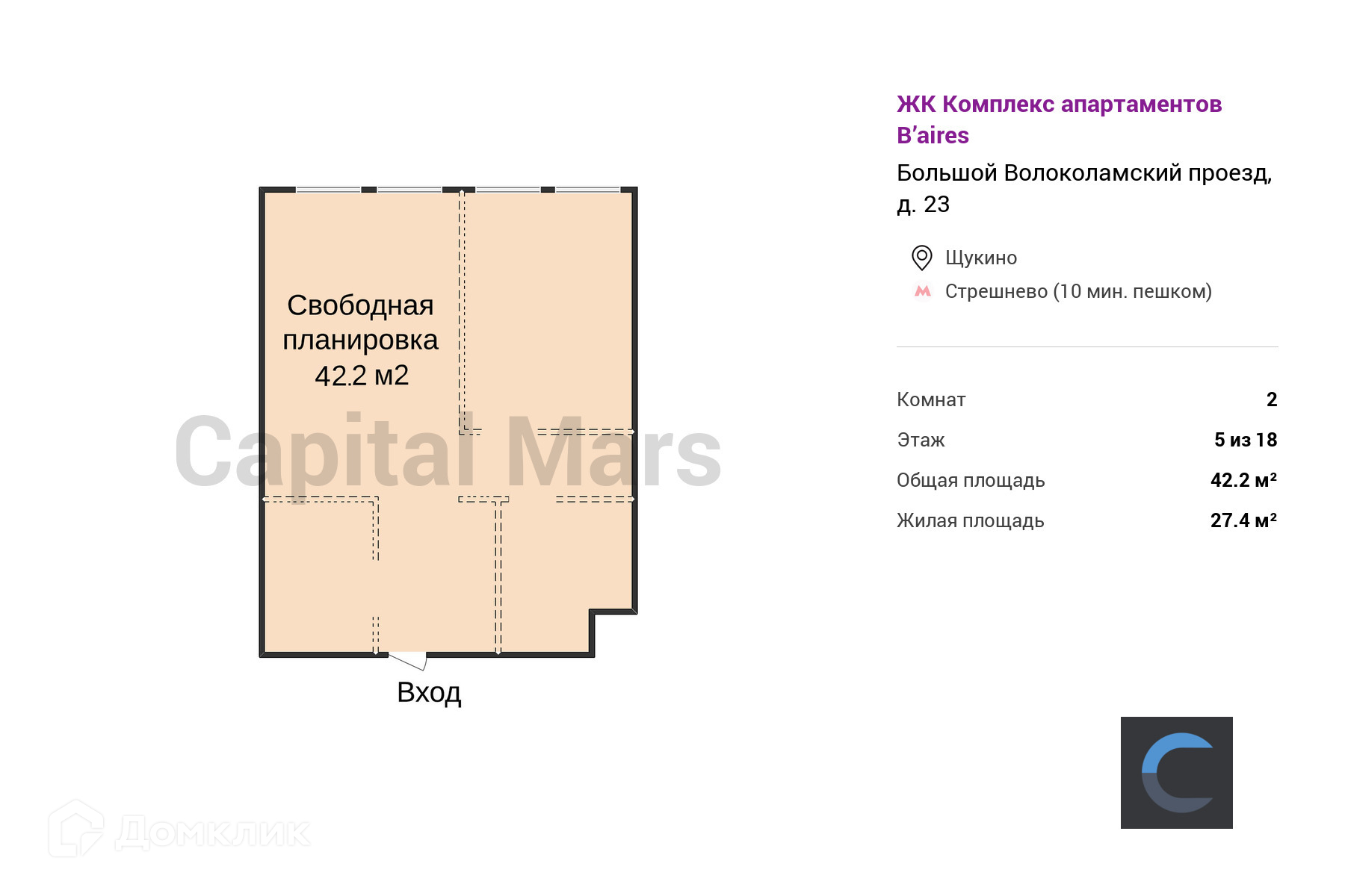 Жилая площадь 27.4 м2