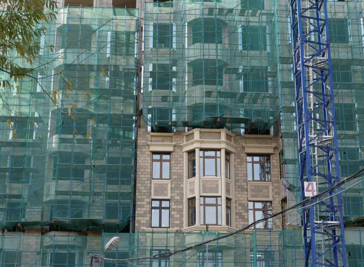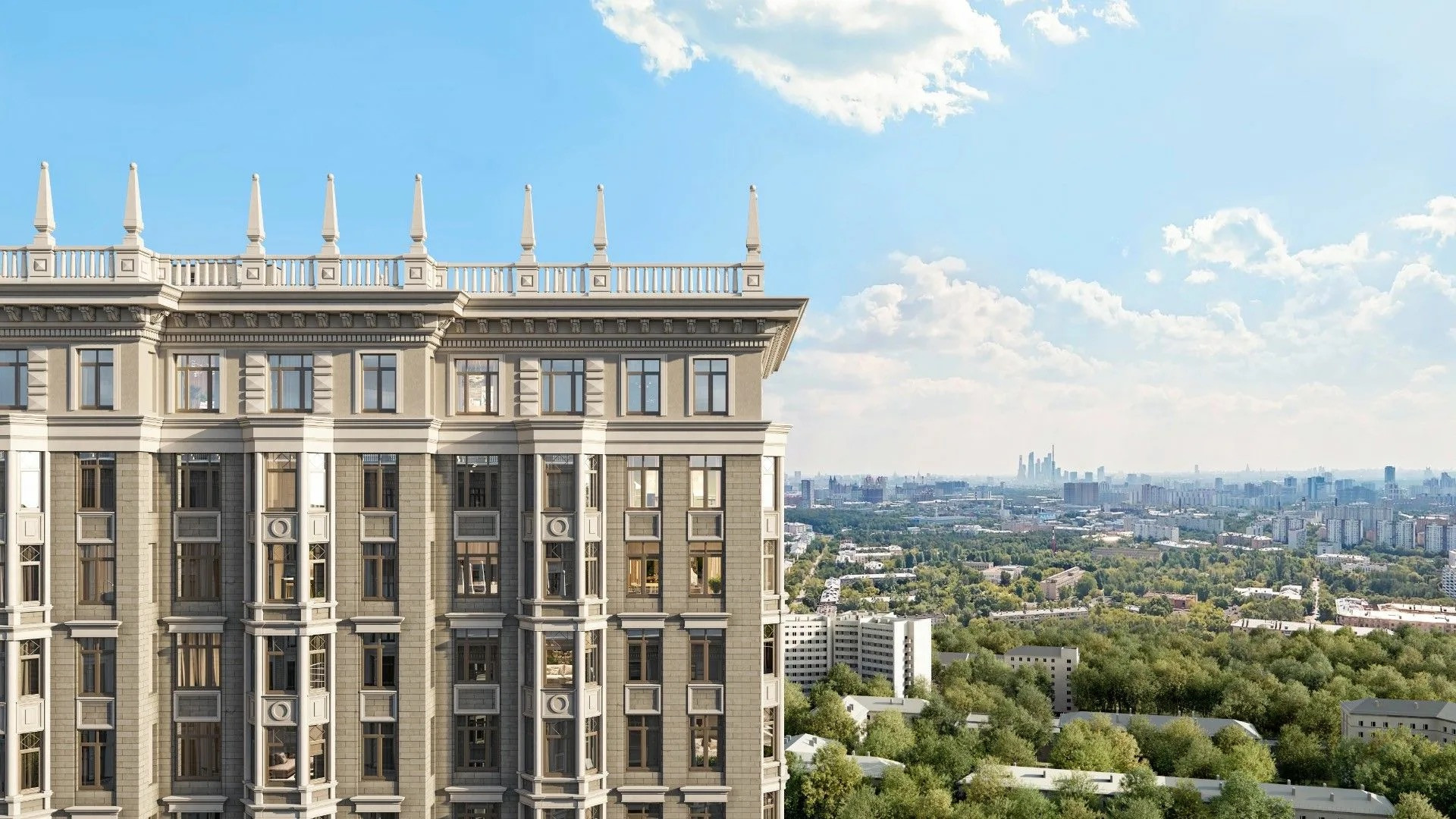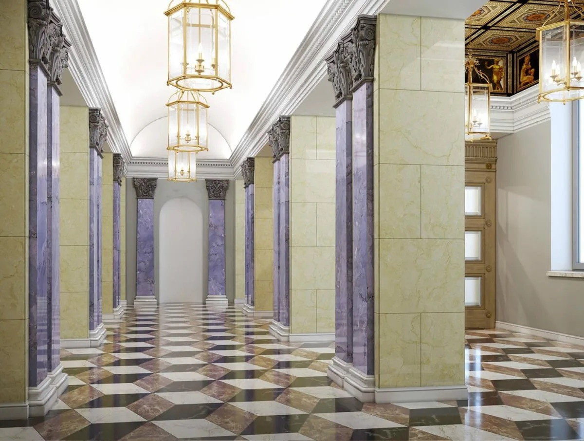Квартира расположена в Доме Жолтовского названного в честь известного архитектора. Идеи великих архитекторов представлены в деталях интерьера: мраморные пилоны, расписные потолки, декоративное оформление лестничных маршей.