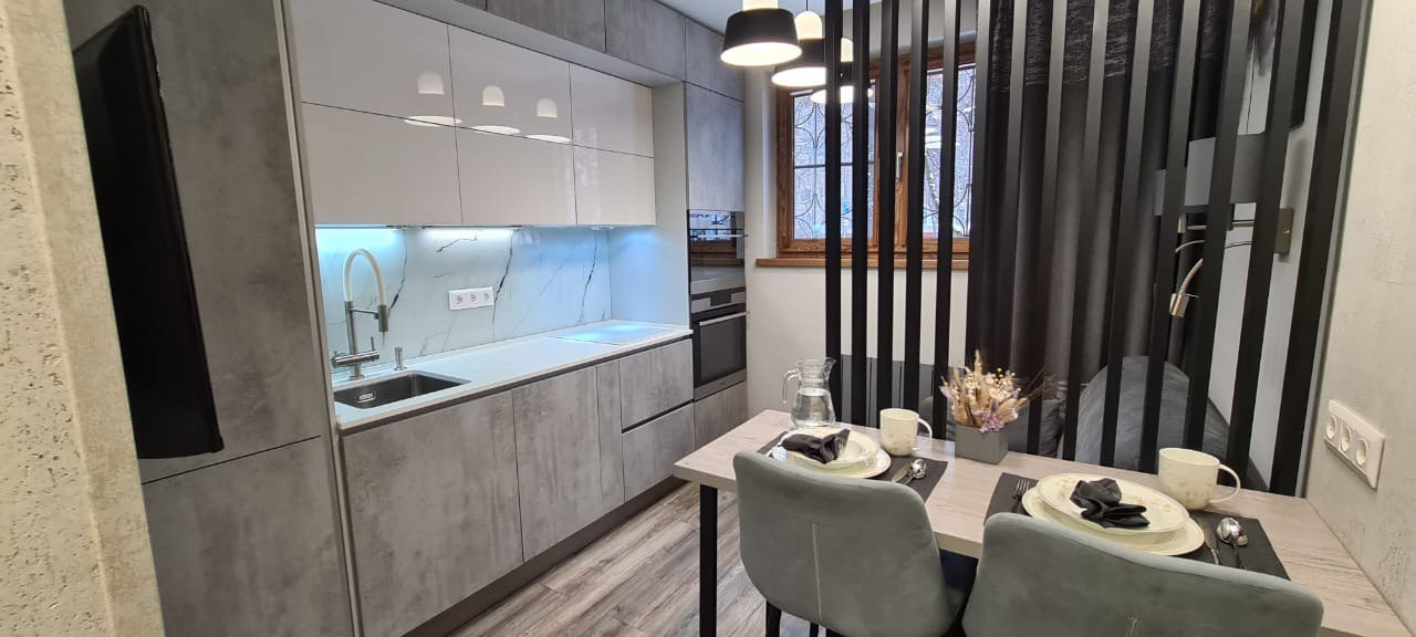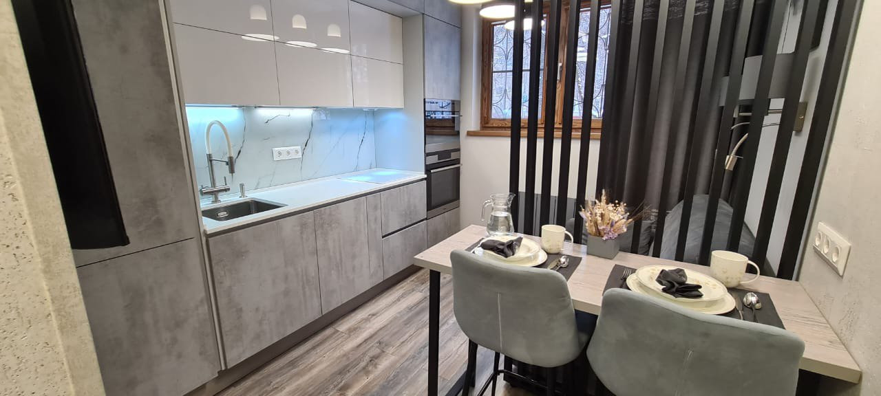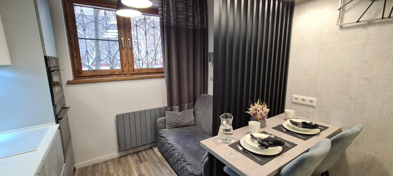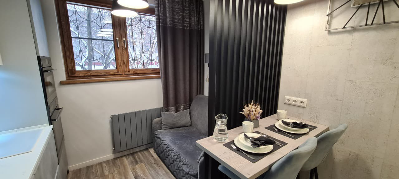 - На кухне установлен диван с гостевым спальным местом 120 на 190 см.
