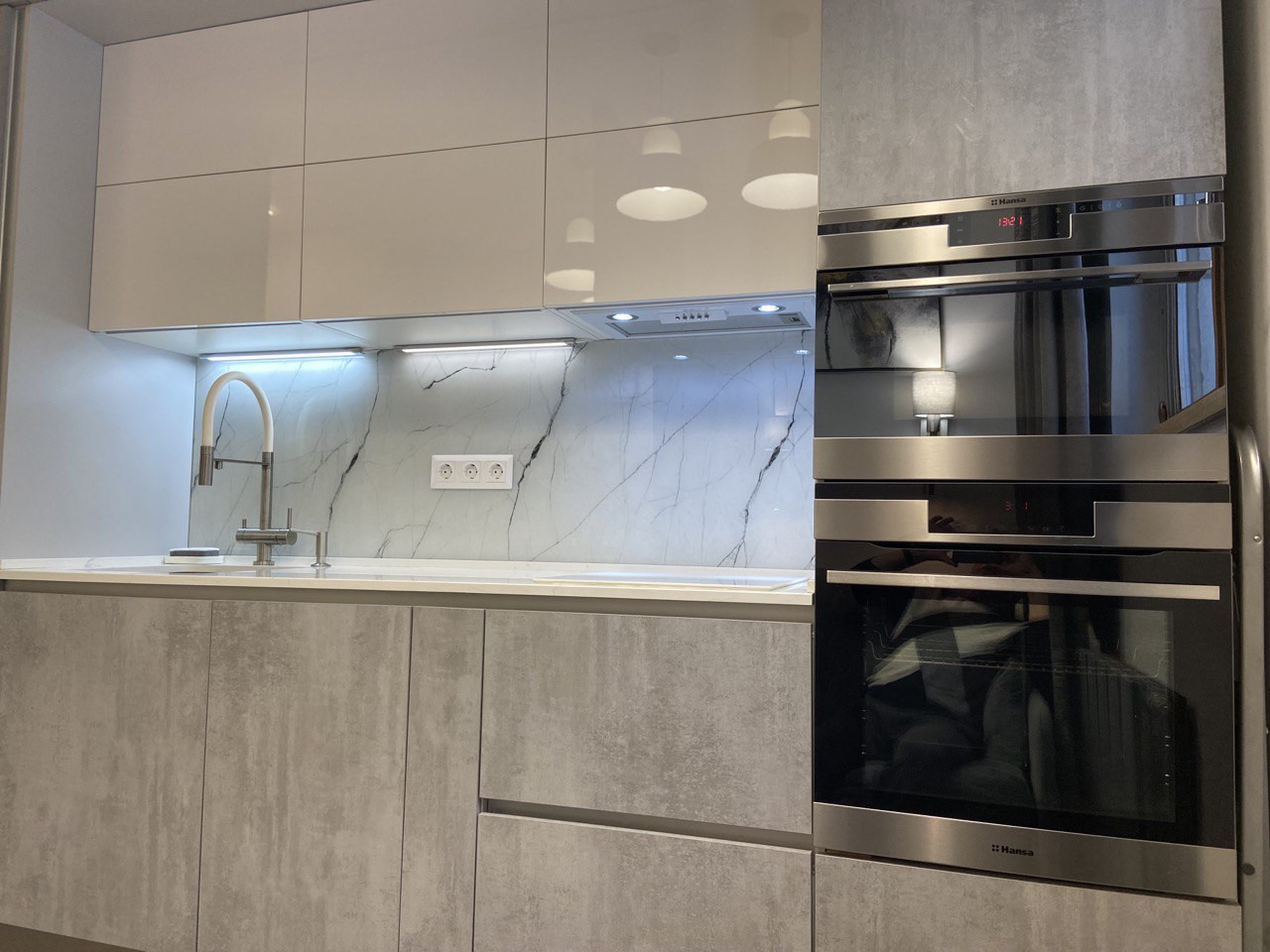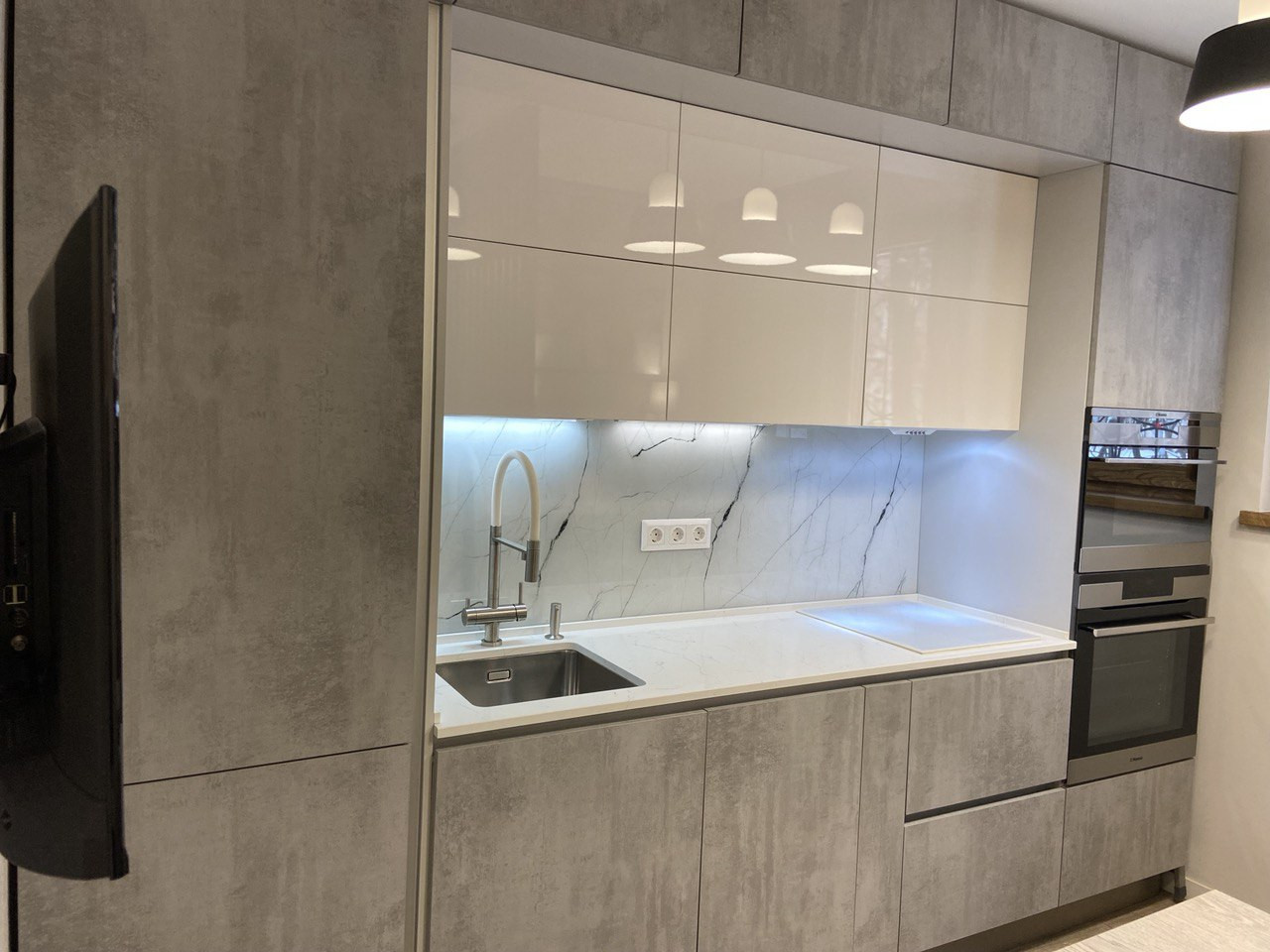 - Кухня со встроенными посудомоечной машиной, холодильником, духовым шкафом и СВЧ с откидной дверцей, варочная индукционная панель.