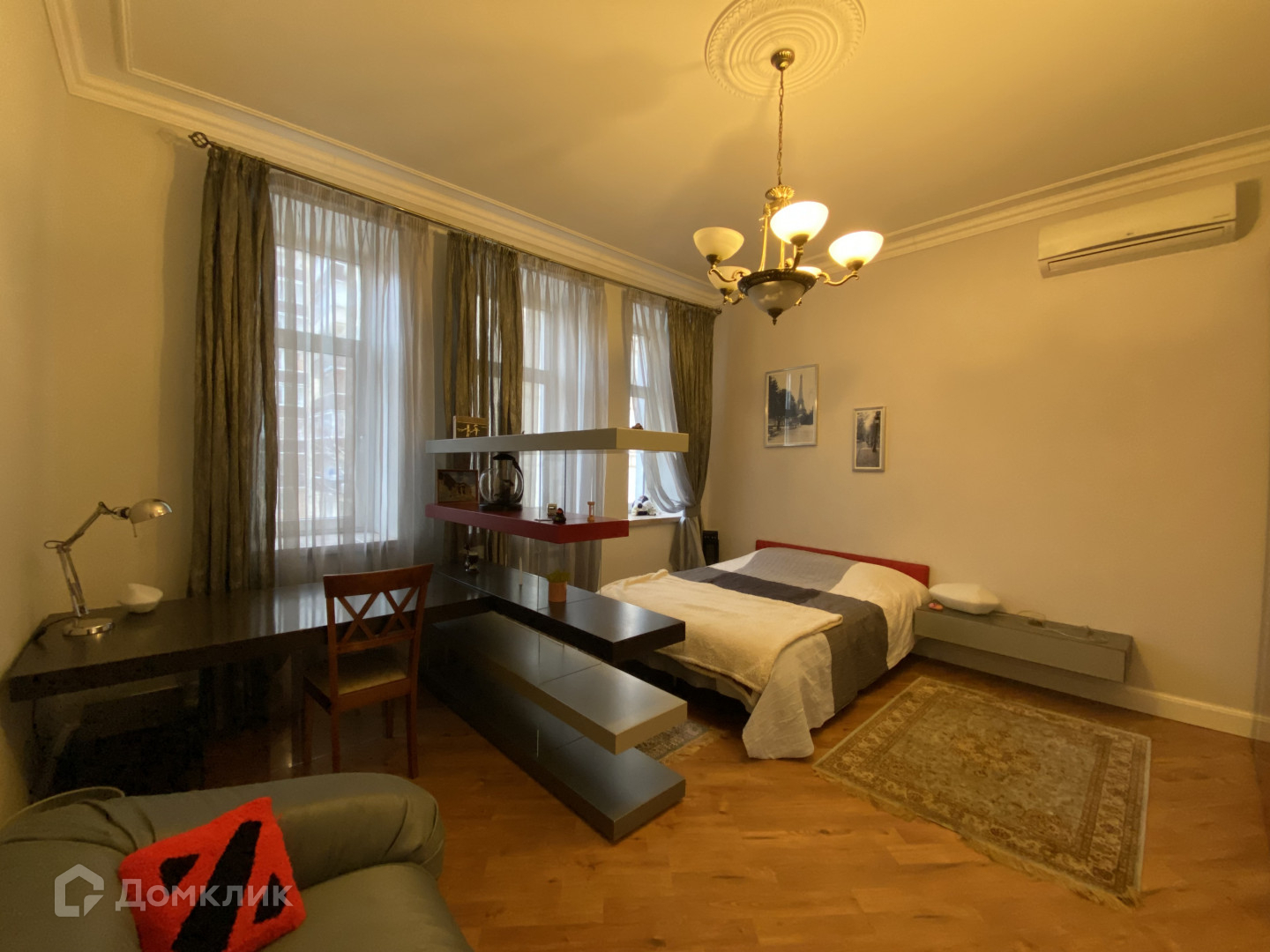 В квартире три больших спальни, кабинет, огромная гостиная с кухней. Два санузла, один из них с окном. Просторный холл с отдельной гардеробной. Потолки - 3,3 м.