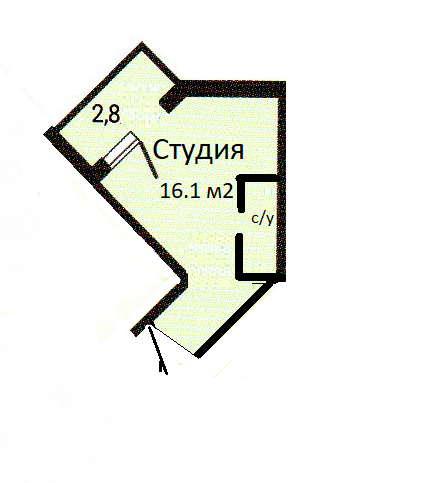 Студия площадью 16.1 м2  (включая застекленную лоджию 2.8 м2).