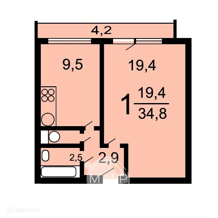 Жилая площадь 19.4 м2