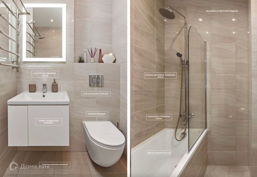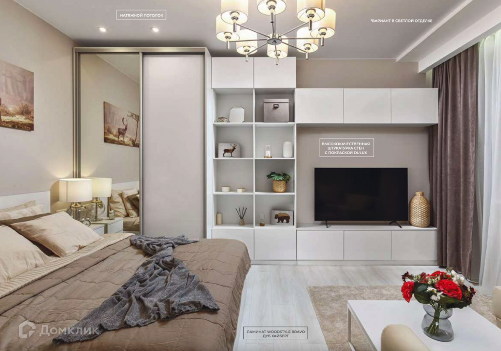 Квартиры в комплексе предлагаются в двух вариантах дизайнерской отделки — светлый с жемчужно-бежевые оттенками и темный с дымчатыми оттенками и элементами лофта. В каждой из них устанавливаются кухонная мебель и бытовая техника от Bosch и Candy. За климат в помещениях ответственны сплит-системы Gree.