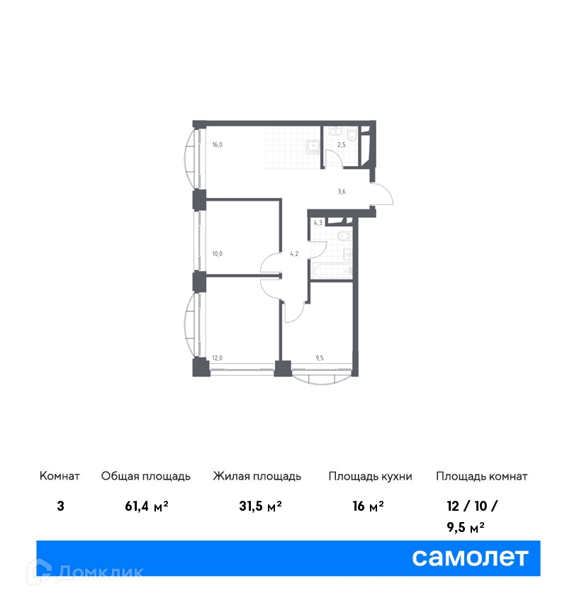 Общая площадь 62.1 м2