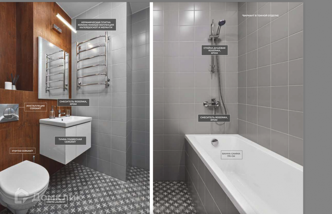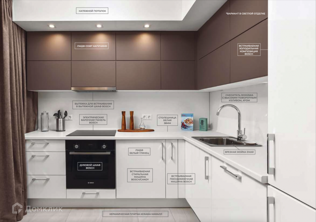 Квартиры в комплексе предлагаются в двух вариантах дизайнерской отделки — светлый с жемчужно-бежевые оттенками и темный с дымчатыми оттенками и элементами лофта. В каждой из них устанавливаются кухонная мебель и бытовая техника от Bosch и Candy. За климат в помещениях ответственны сплит-системы Gree.