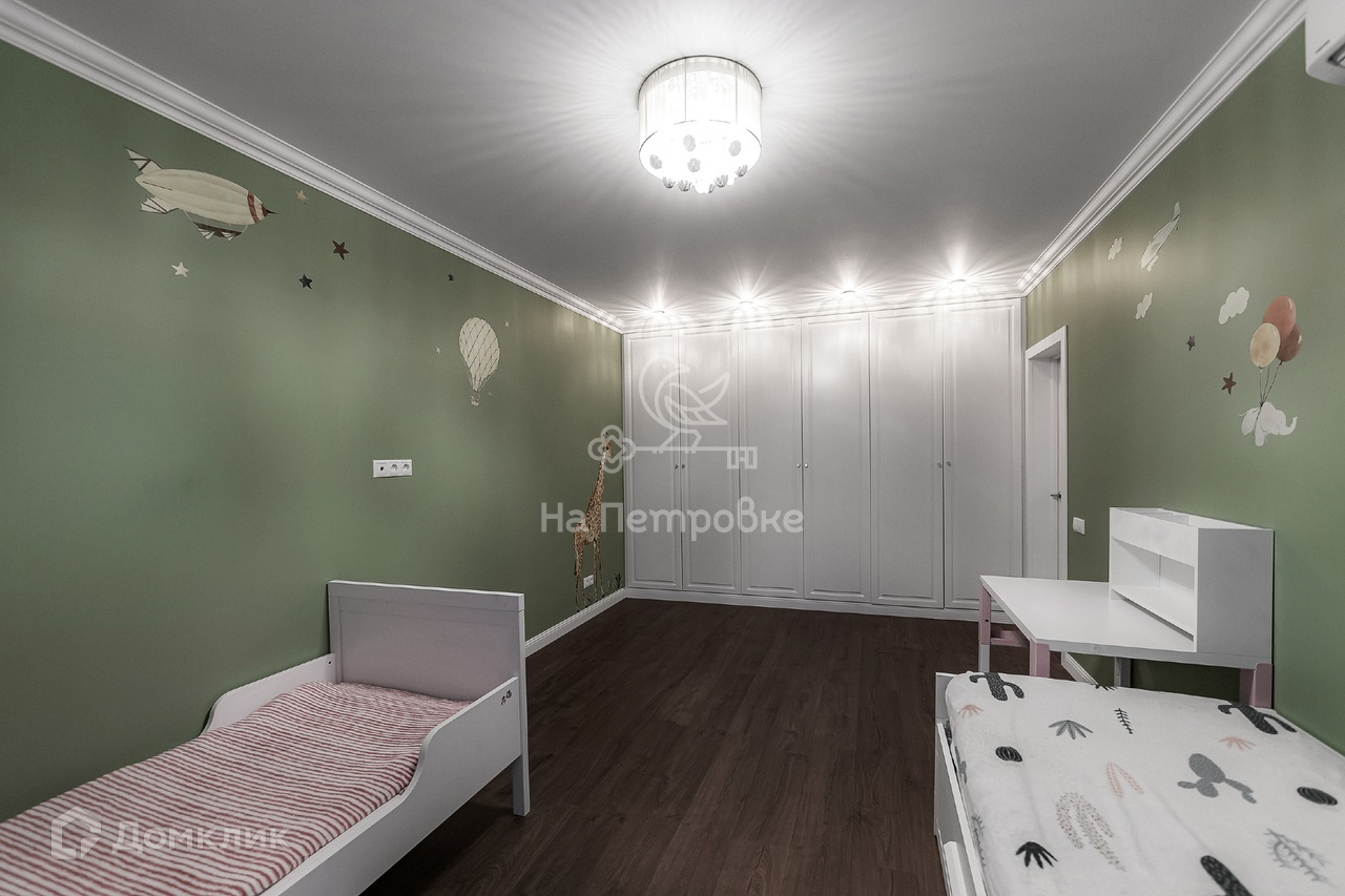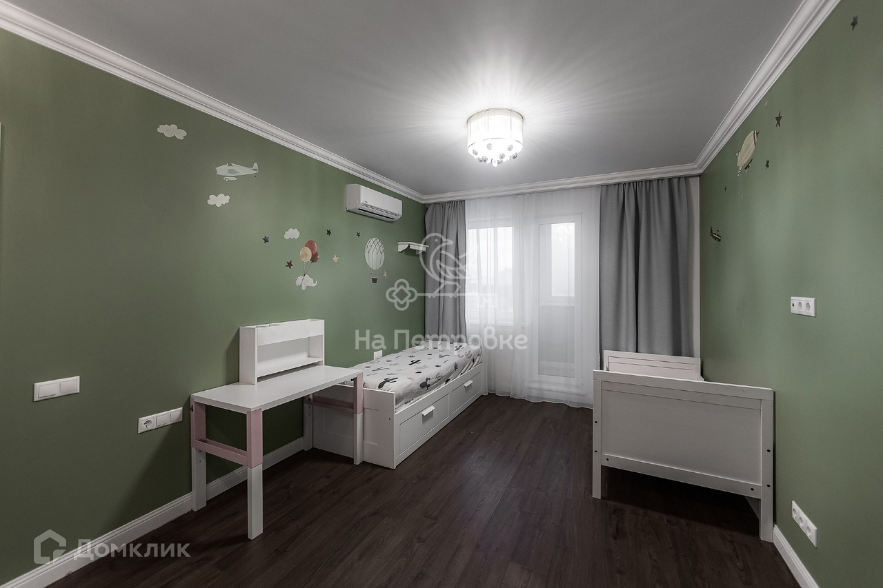 В квартире изолированные комнаты, большая комната в нежных зеленых тонах с выходом на балкон. Встроенный большой шкаф с одной стороны и правильно подобранный свет делают комнату идеальной спальной (детские наклейки можно убрать без следов).