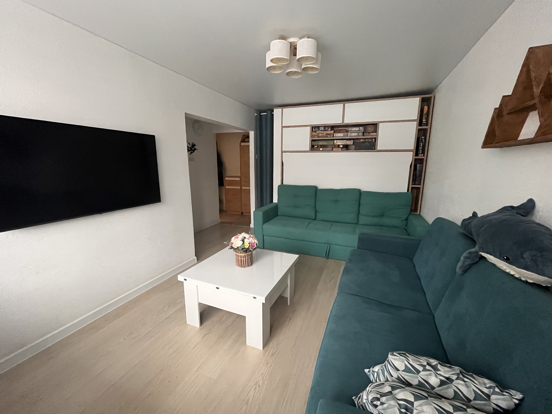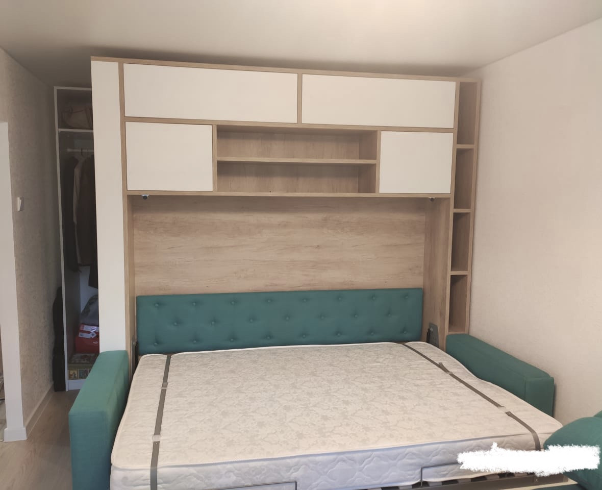Остаётся мебель: встроенная кухня (вытяжка, посудомойка, газовая панель, духовой электрический шкаф), трансформер 3в1: кровать-диван-шкаф, гардеробная, ванная, шкаф в ванной, стиральная машина, проточный водонагреватель.