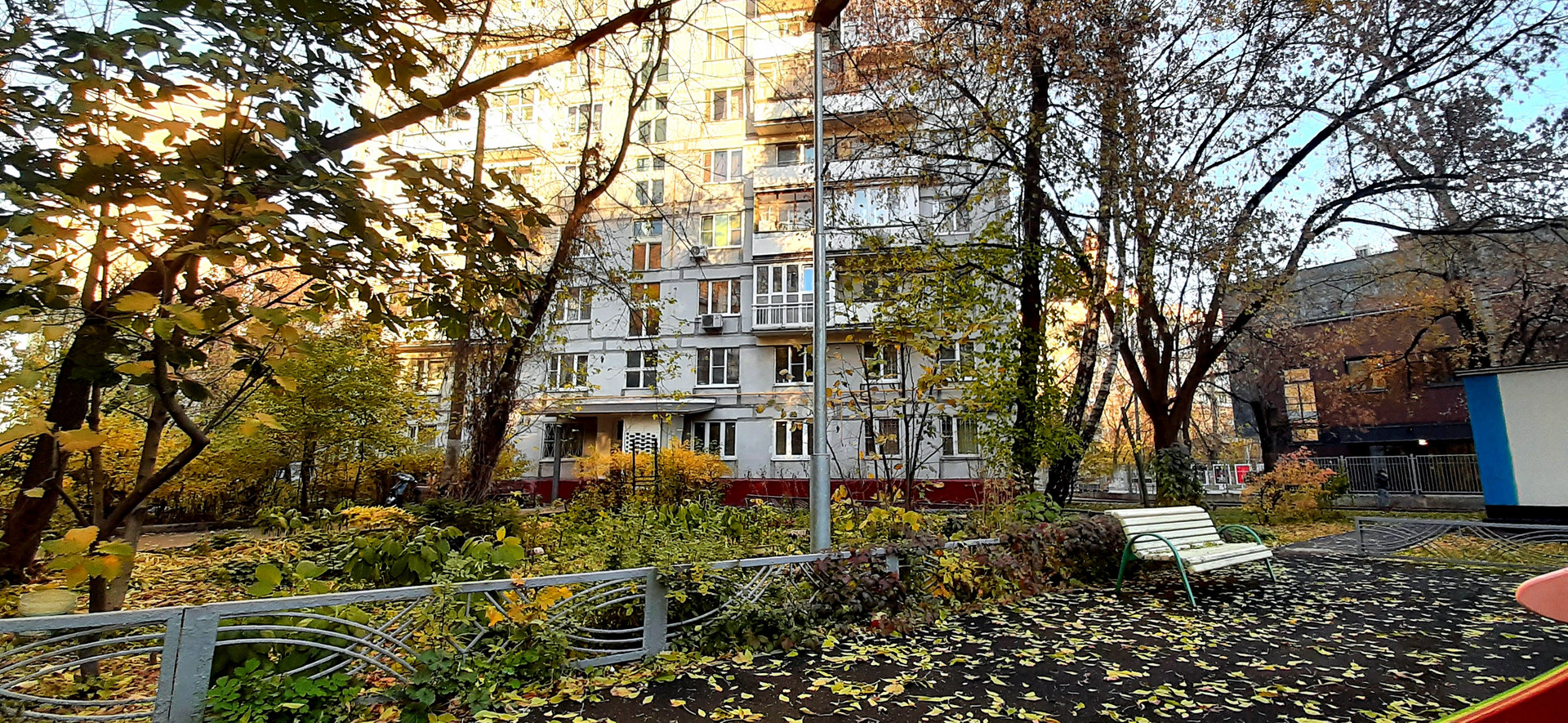 Дом расположен вдоль проспекта. Во дворе детская площадка, спортивная площадка, много насаждений: деревья и цветущие мини-сады. Парковка открытая во дворе.