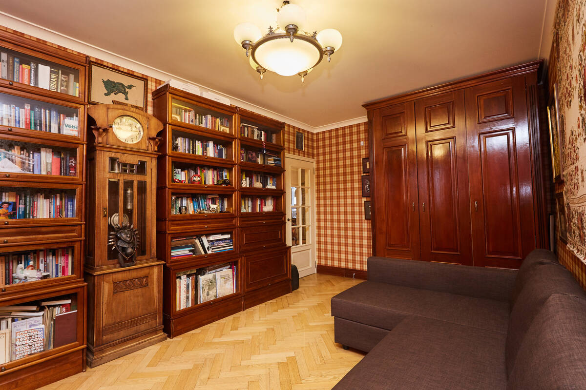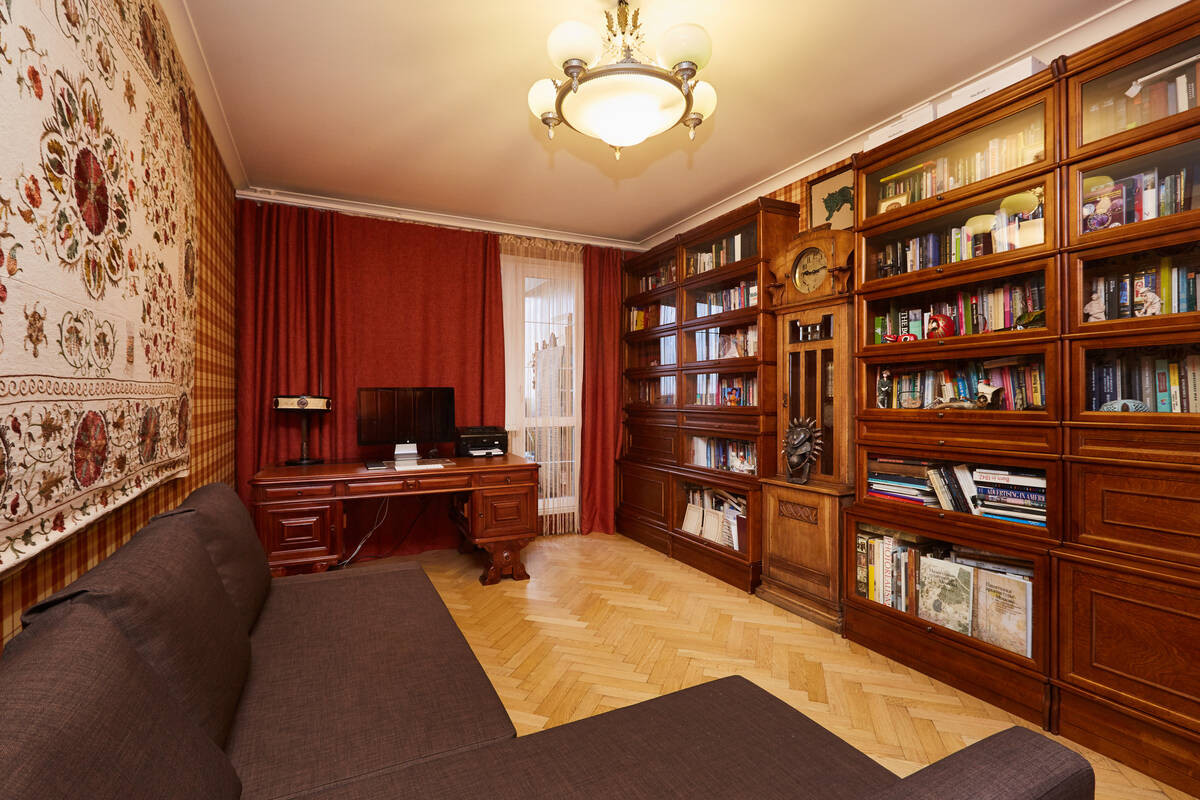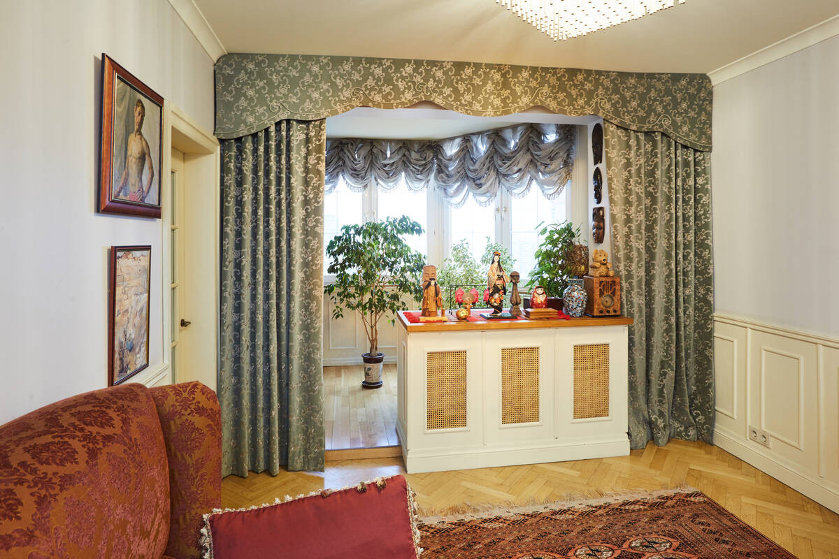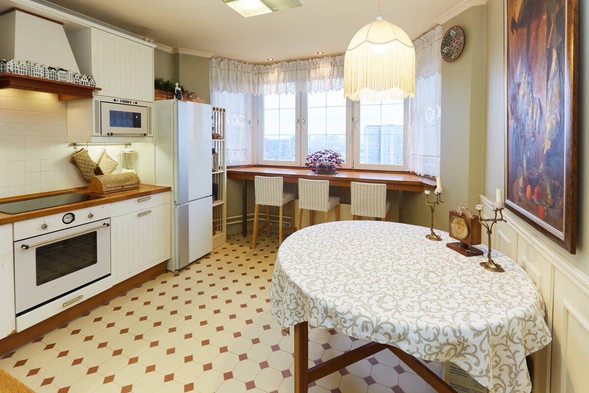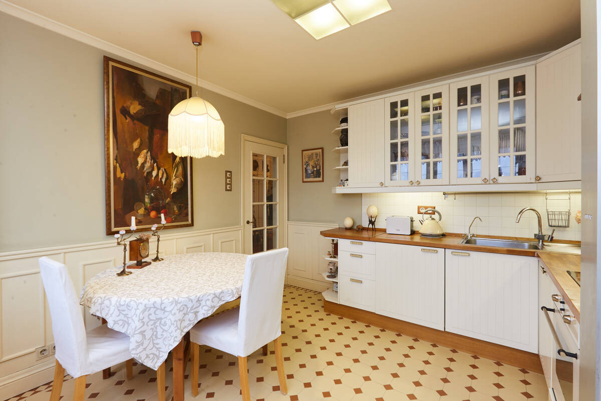 Просторная гостиная обшита деревянными панелями с дубовым шпоном.Лоджия утеплена, паркетный пол на ней с подогревом. Большая кухня около 13 кв.м. На полу – классический узор из метлахской плитки. Барный стол у панорамного окна, из которого по вечерам открывается восхитительный вид на метромост, Москва-реку и Остров Мечты. По праздникам отсюда одновременно можно наблюдать до четырех разных салютов. Кухня оборудована вытяжкой, посудомоечной и стиральной машинами, фильтром для воды.
