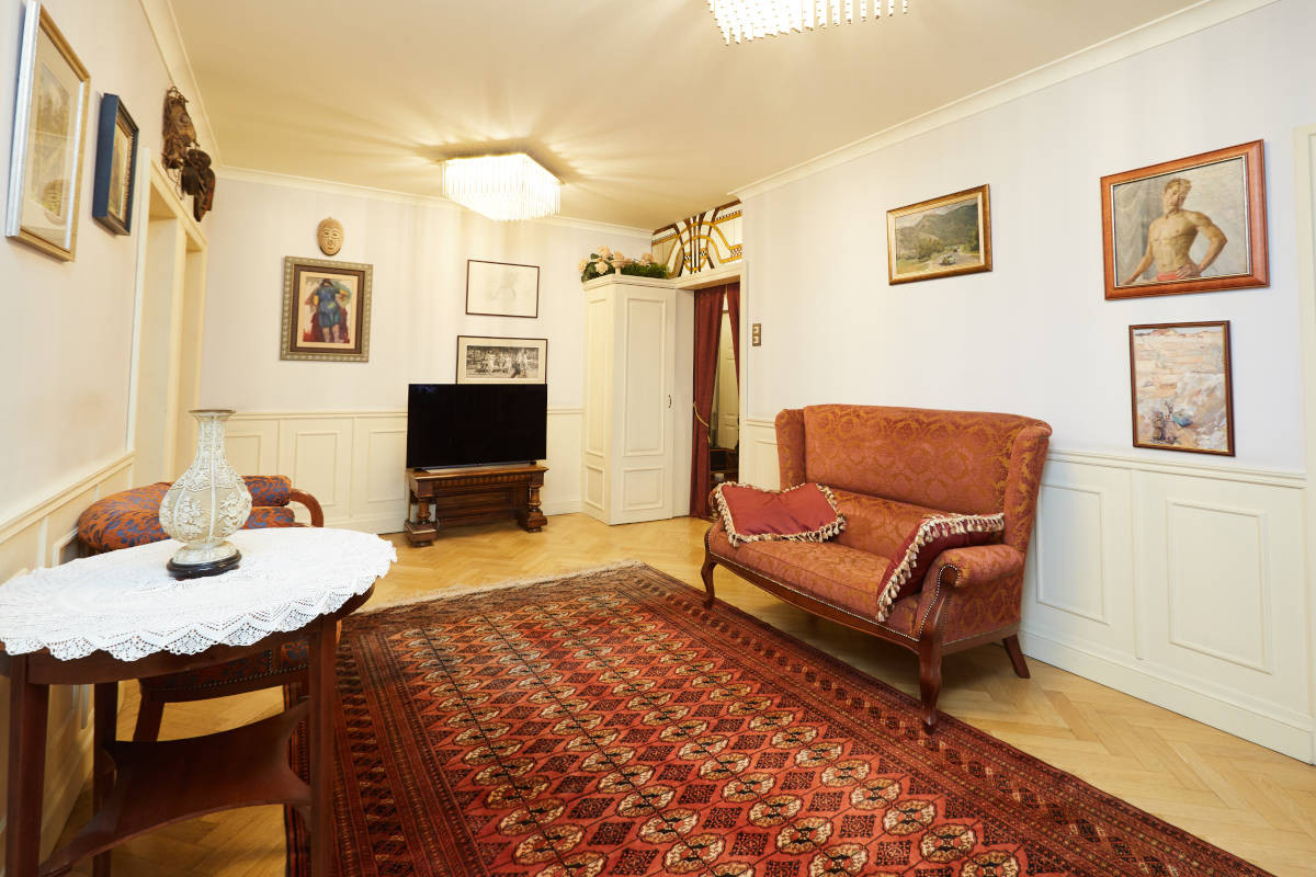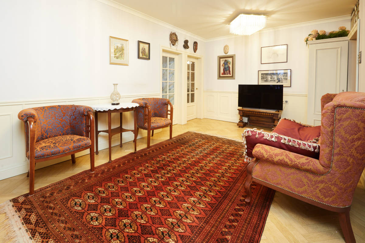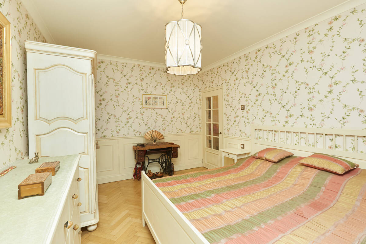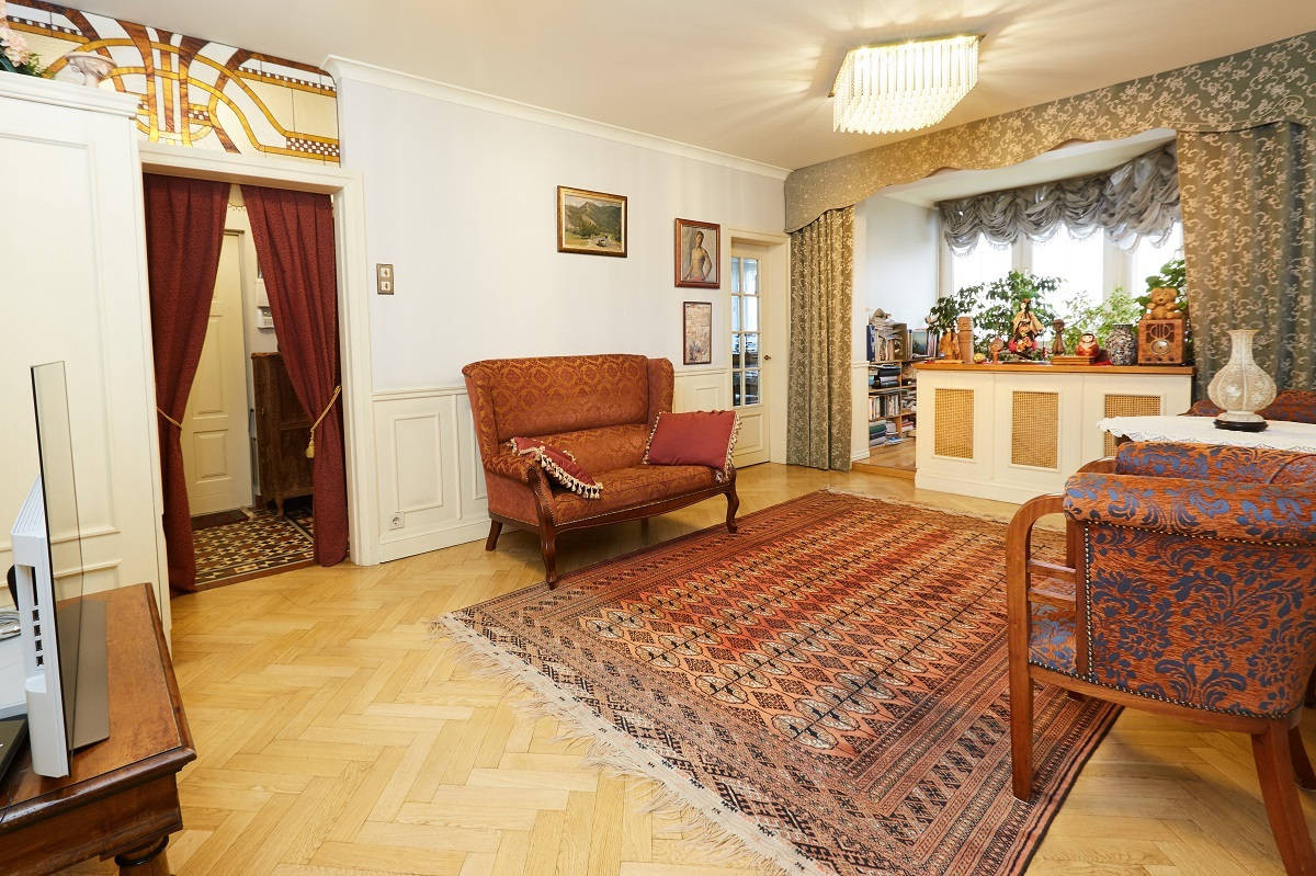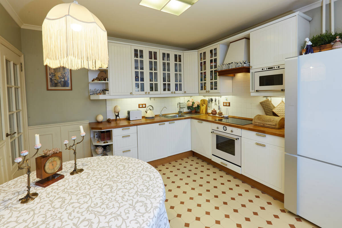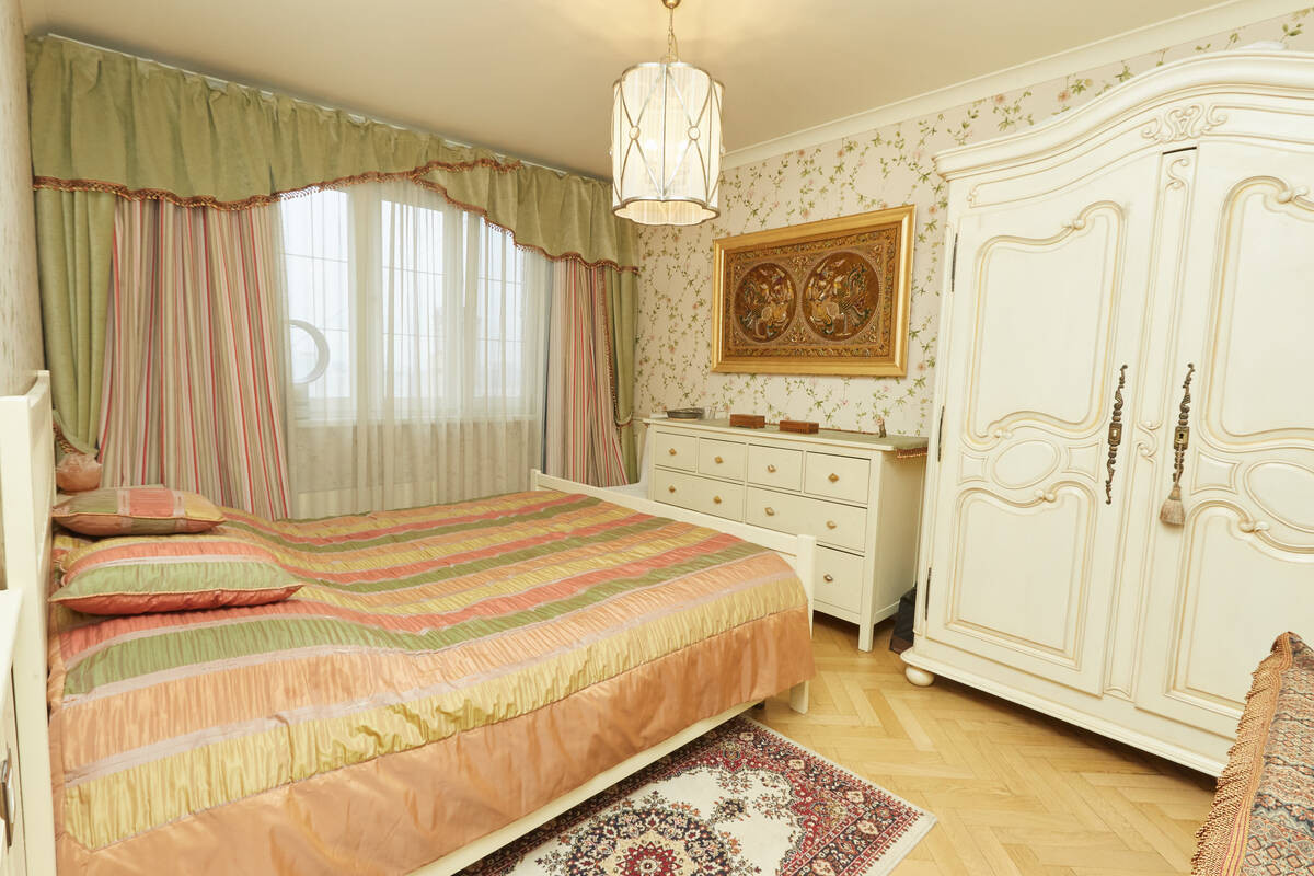 Просторная гостиная обшита деревянными панелями с дубовым шпоном.Лоджия утеплена, паркетный пол на ней с подогревом. Большая кухня около 13 кв.м. На полу – классический узор из метлахской плитки. Барный стол у панорамного окна, из которого по вечерам открывается восхитительный вид на метромост, Москва-реку и Остров Мечты. По праздникам отсюда одновременно можно наблюдать до четырех разных салютов. Кухня оборудована вытяжкой, посудомоечной и стиральной машинами, фильтром для воды.