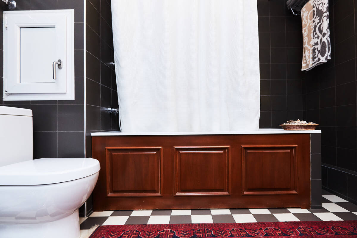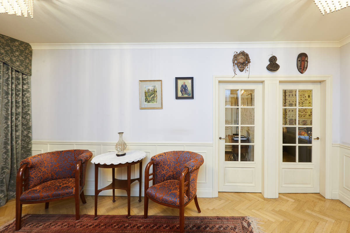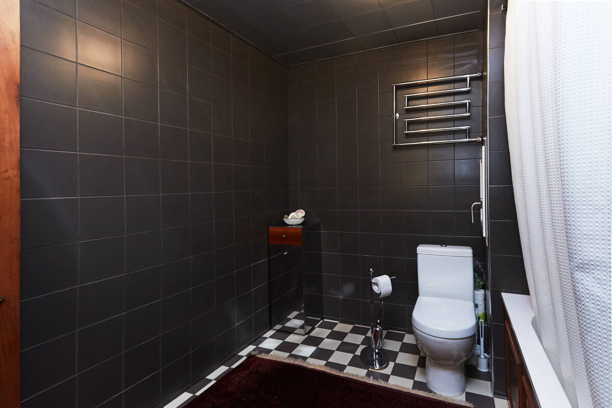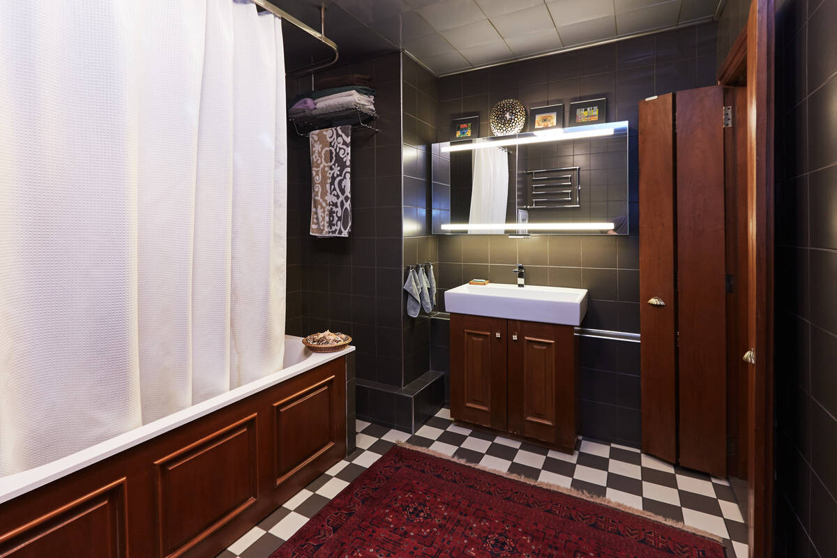 Санузел площадью более 9 кв. м., оснащенный сантехникой фирмы Villeroy & Boch.Оригинальная дверь выполнена из натурального дерева, экран для ванны и тумбочка под раковину выполнены под заказ известным краснодеревщиком. Этот же мастер сделал и другие изделия из дерева для этой квартиры: шкаф для верхней одежды, двери, деревянные панели, платяной шкаф в кабинете.