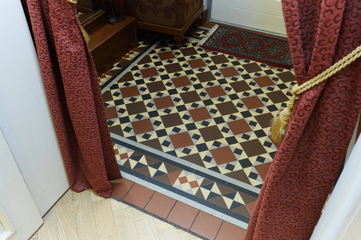 Небольшой входной вестибюль отделен от гостиной порталом с авторским витражом работы Анны Бутиной, доцента Московской государственной художественно-промышленной академии им. С. Г. Строганова. На полу –вручную выложенное мозаичное полотно из мелкой наборной метлахской плитки Петерсхэм (Petersham).