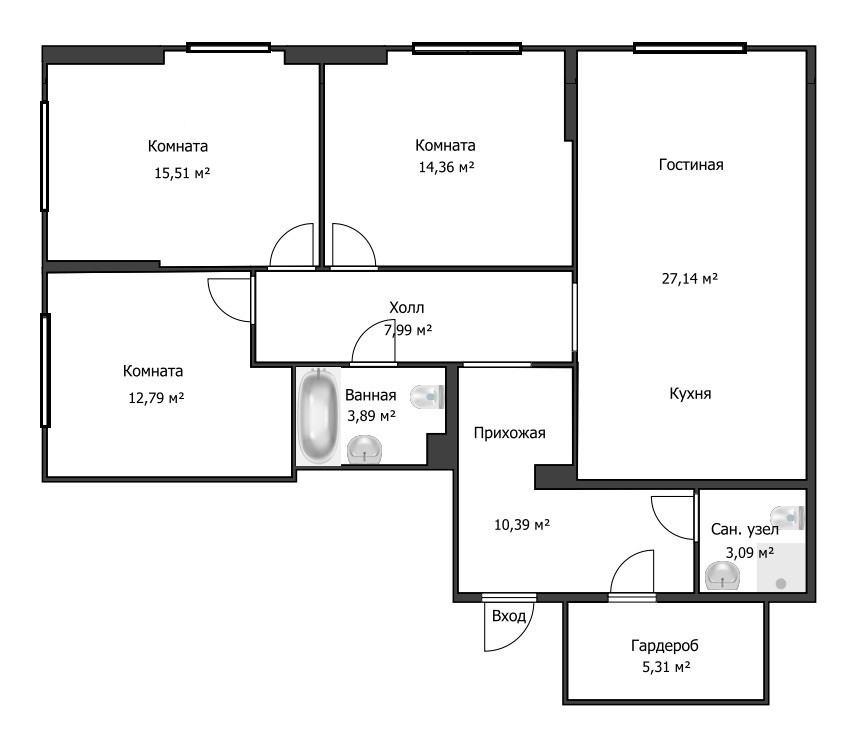 Площадь кухни 27.1 м2