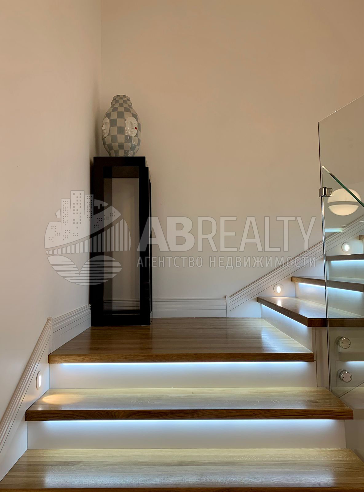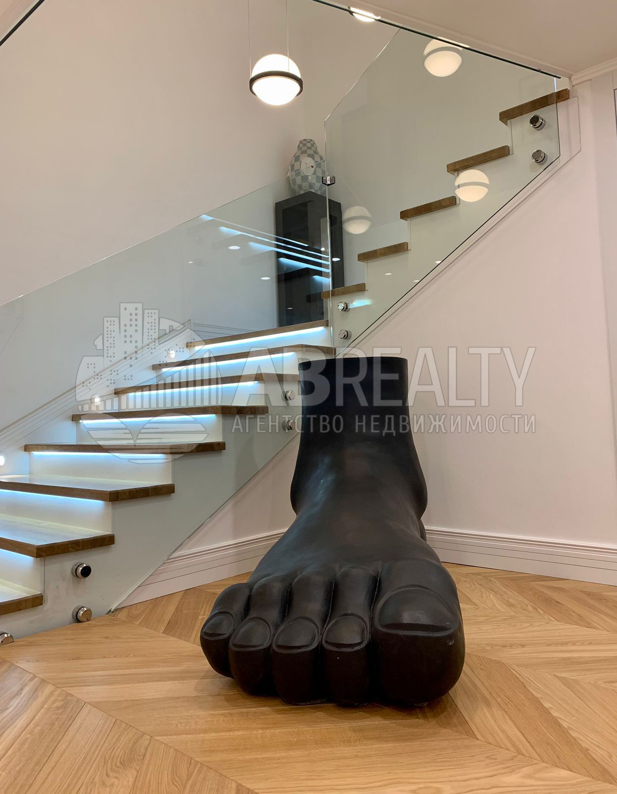 Между 1 и 2 уровнем сделана парящая лестница со стеклянным ограждением.