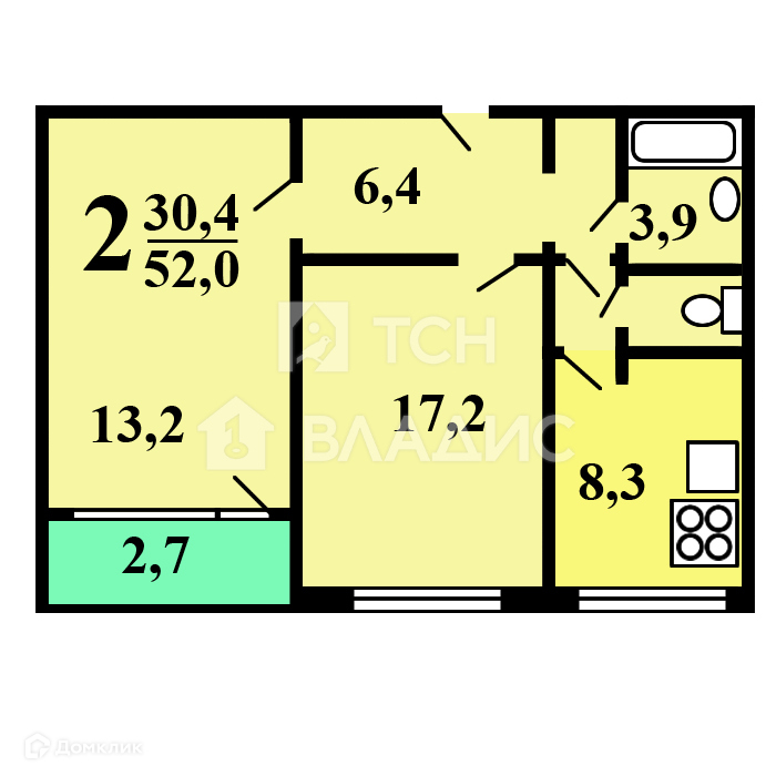 Общая площадь 52.3 м2