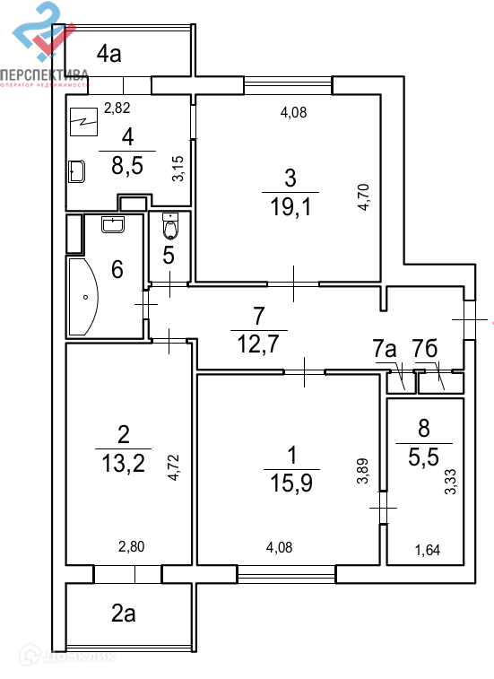 -комнаты просторные 19,1 м2, 15,9 м2, 13,2 м2, кухня 8,5 м2, вместительная гардеробная 5,5 м2